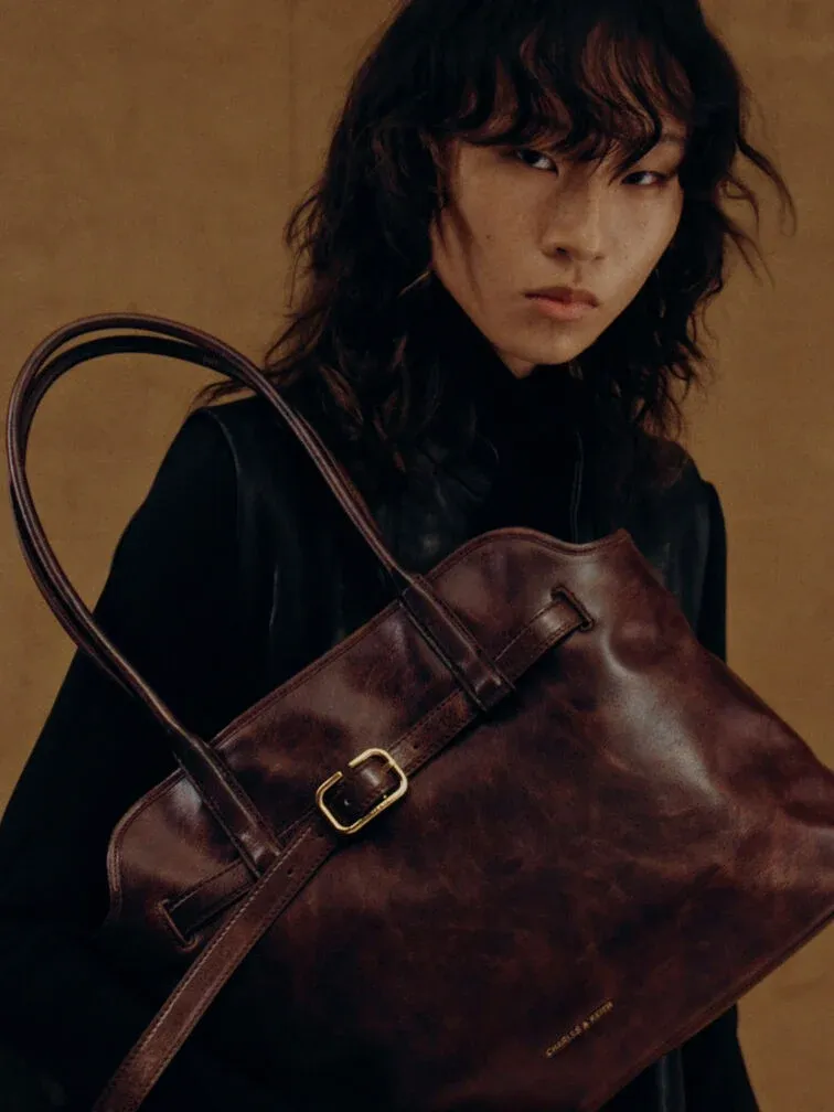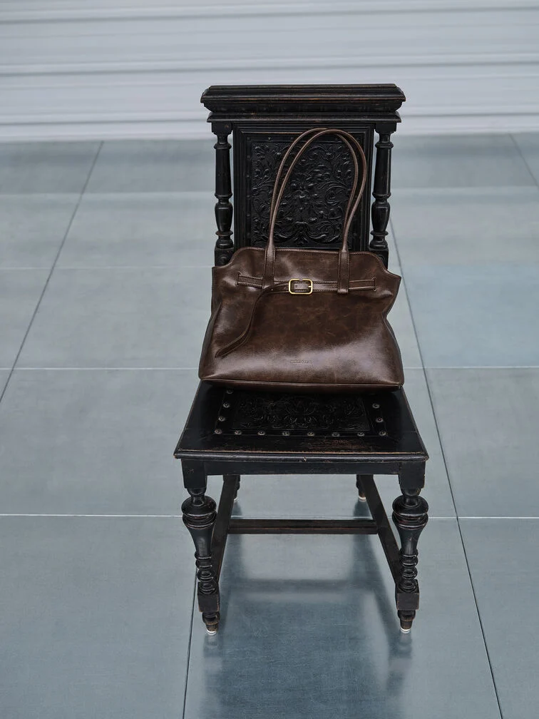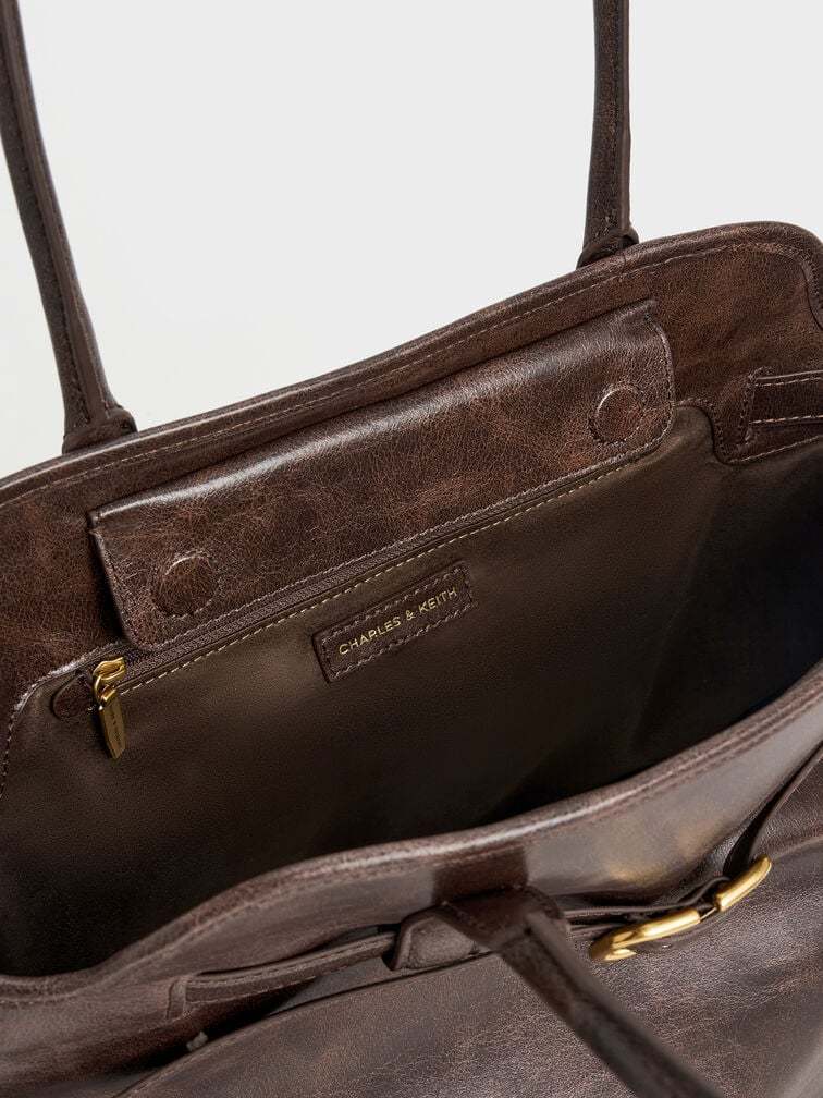 This Victoria tote bag in coffee brown features an edgy distressed finish, a belted detail, a trapeze silhouette and double top handles. Pair it with classic tailoring to create a polished and effortlessly stylish everyday look.