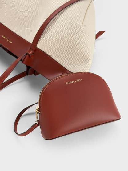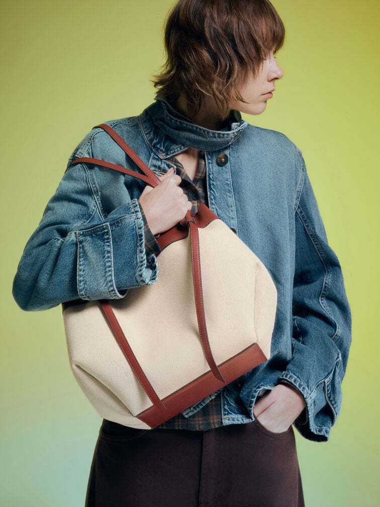This Calla tote bag is made with canvas and features brick-brown accents, double handles, a detachable pouchm a magnetic closure and a capacious interior. Let it complement relaxed off-duty outfits with its versatility and everyday elegance.