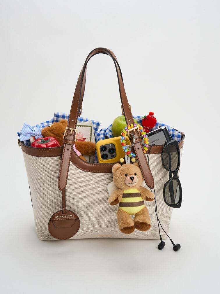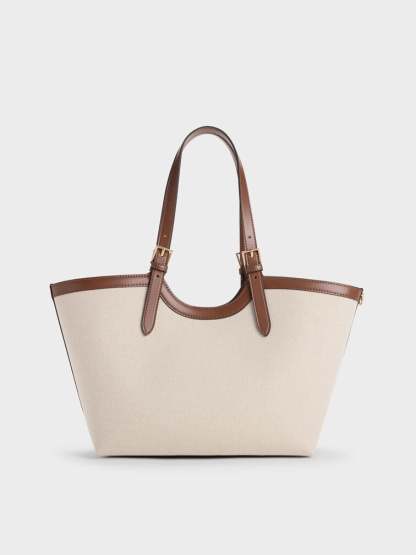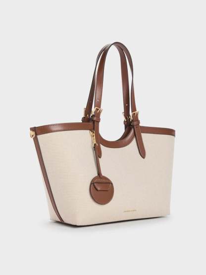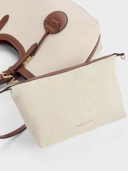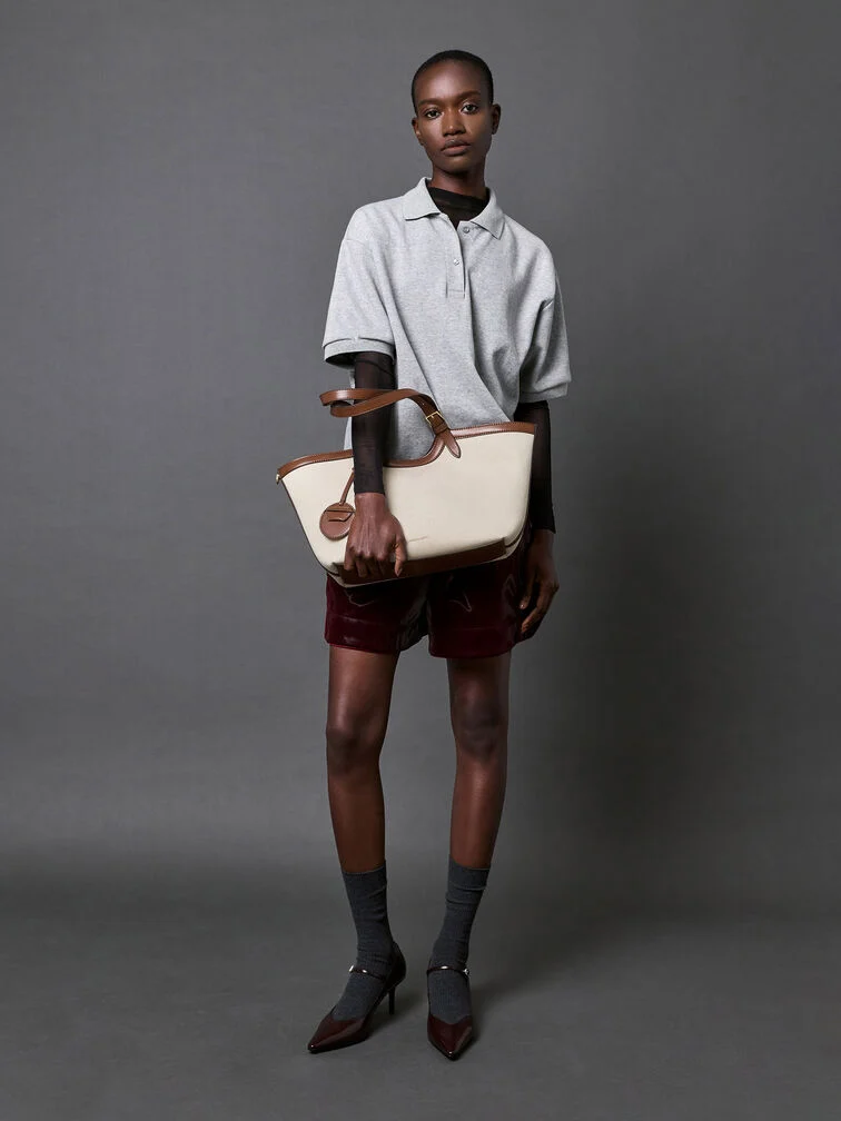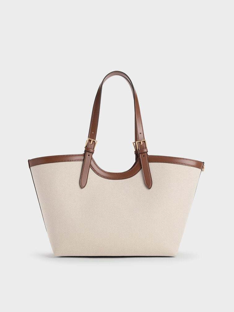 This Enola tote bag in chocolate is made with canvas and features a two-tone design, buckled double handles, and a magnetic closure. It also comes with a detachable pouch and keychain. Versatile, understated and polished, it will add a striking touch to your workwear looks.