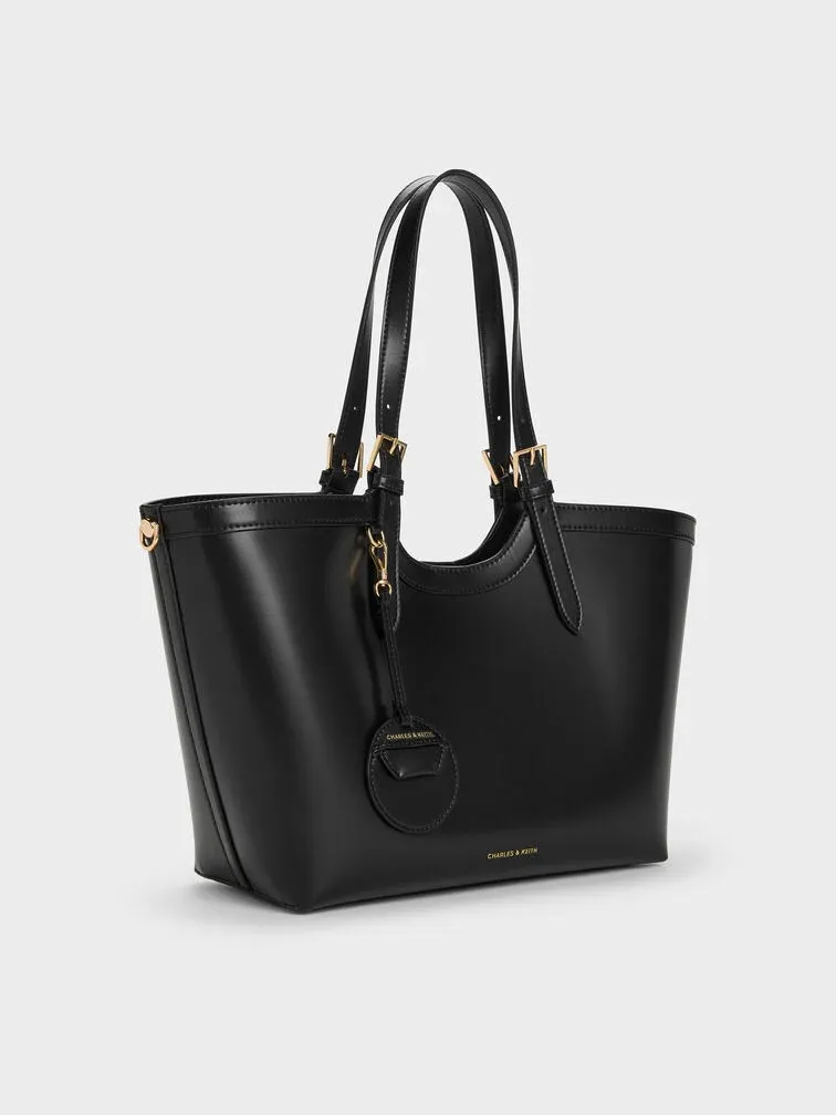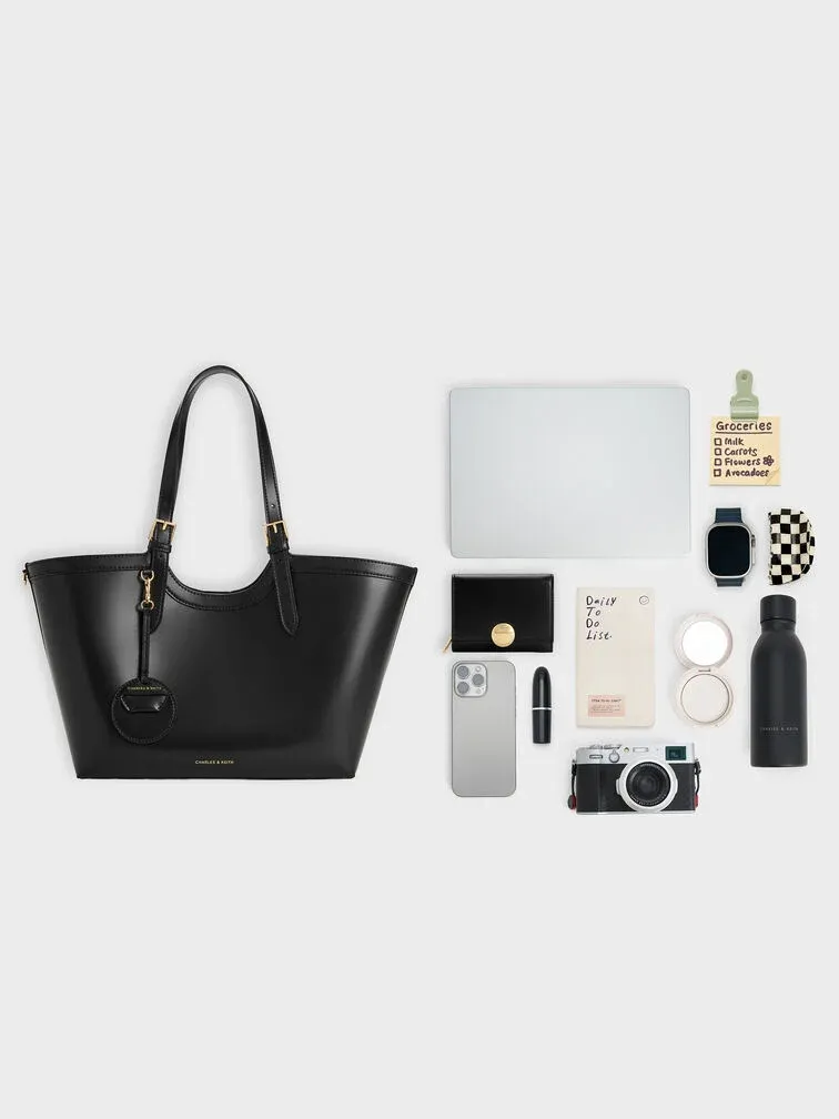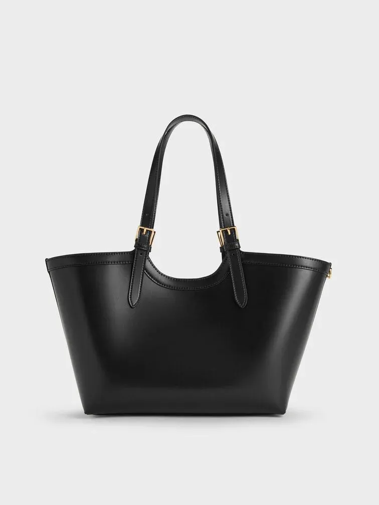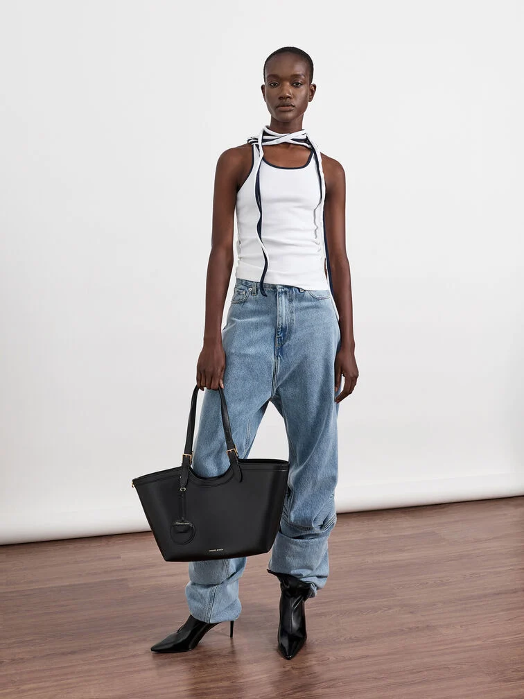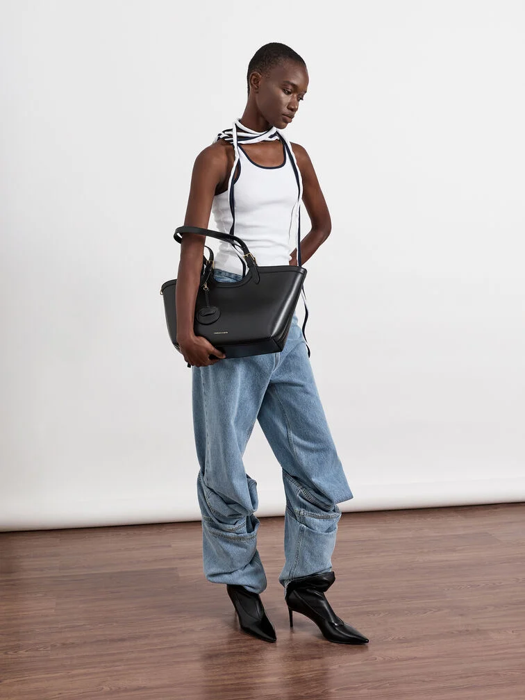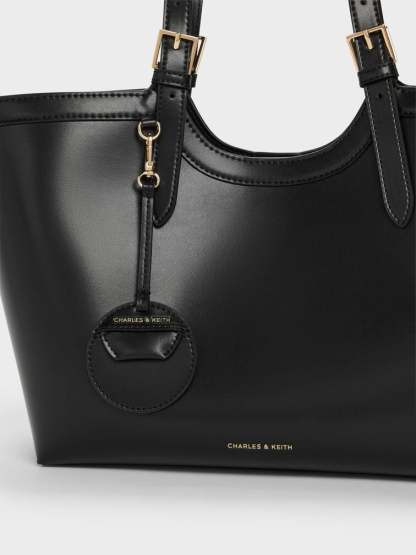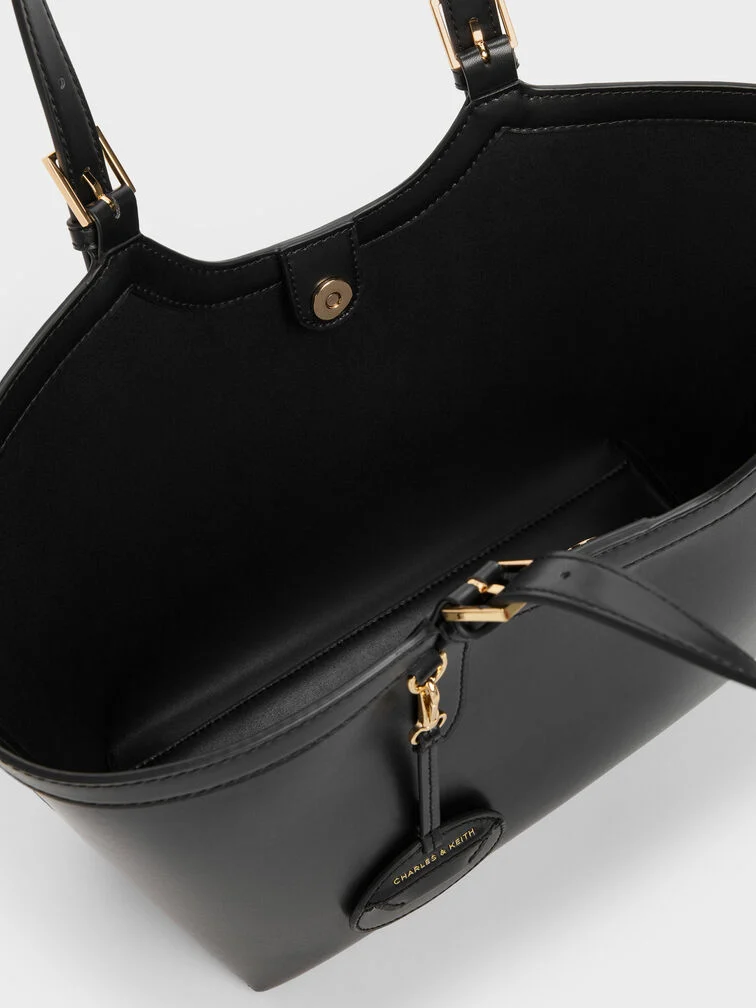 This Enola tote bag in black features buckled double handles and a magnetic closure. It also comes with a detachable pouch and keychain. Let it balance soft shapes and clean tailoring to create outfits that will move seamlessly through your day.