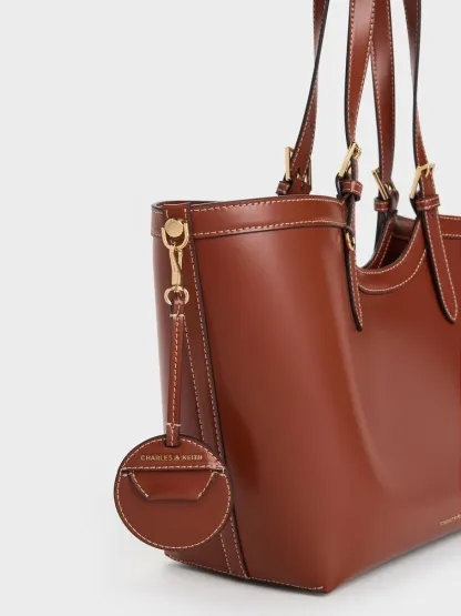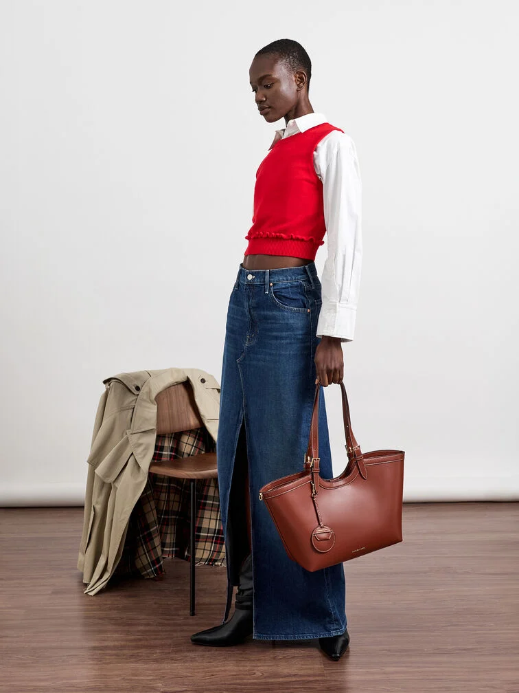 This Enola tote bag in brick features buckled double handles and a magnetic closure. It also comes with a detachable pouch and keychain. It will hold everything you need in a day with room to spare.