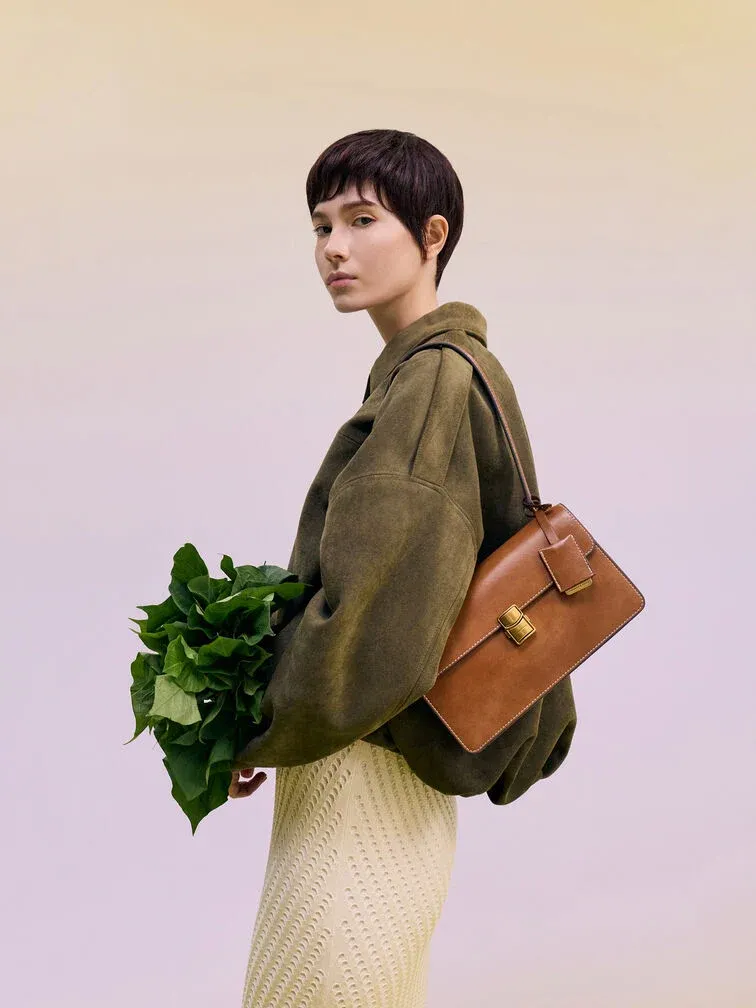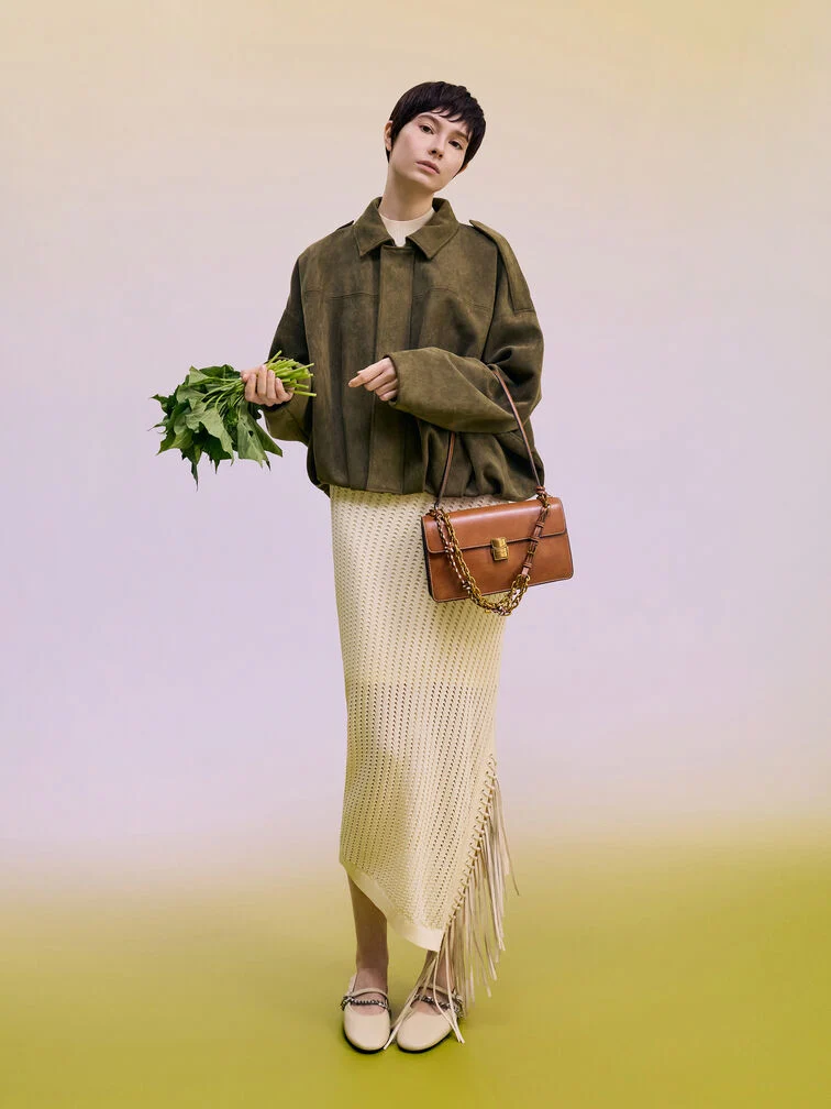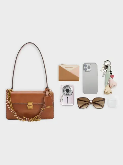 This Acelynn shoulder bag in tan features a distressed finish, a rope-chain strap, a distinctive metallic buckle, an elongated handle and a front-flap design with a push-lock closure. Carry it to add a striking and elegant element to your everyday ensembles.