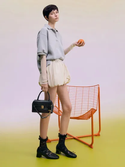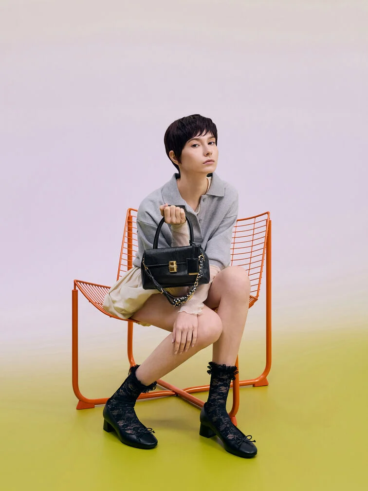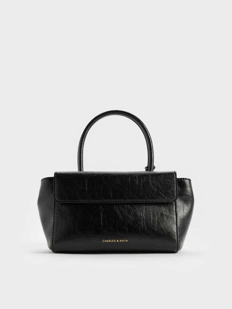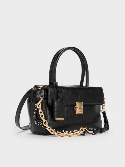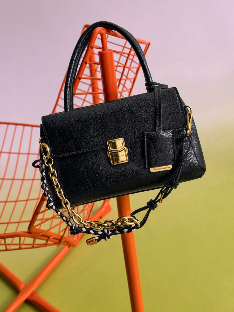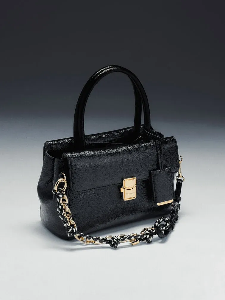 This Acelynn tote bag in black features a rope-chain strap, a distinctive metallic buckle, double handles, and a front-flap design with a push-lock closure. Carry it to elevate your work ensembles effortlessly.