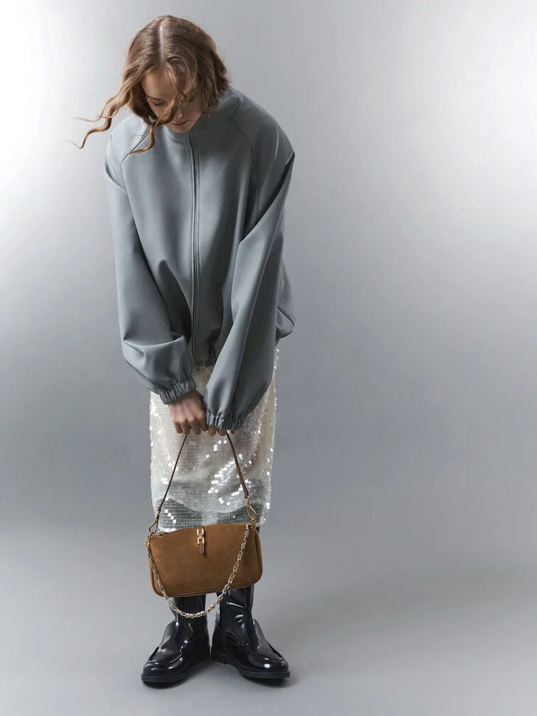 This Adalyn shoulder bag in mocha brown features a metallic buckle, rectangular silhouette and chain handle. It will elevate your everyday looks with its luxurious texture and sleek modern design.