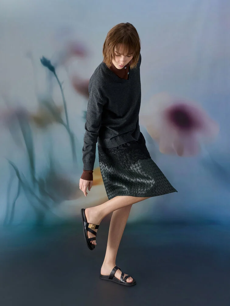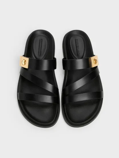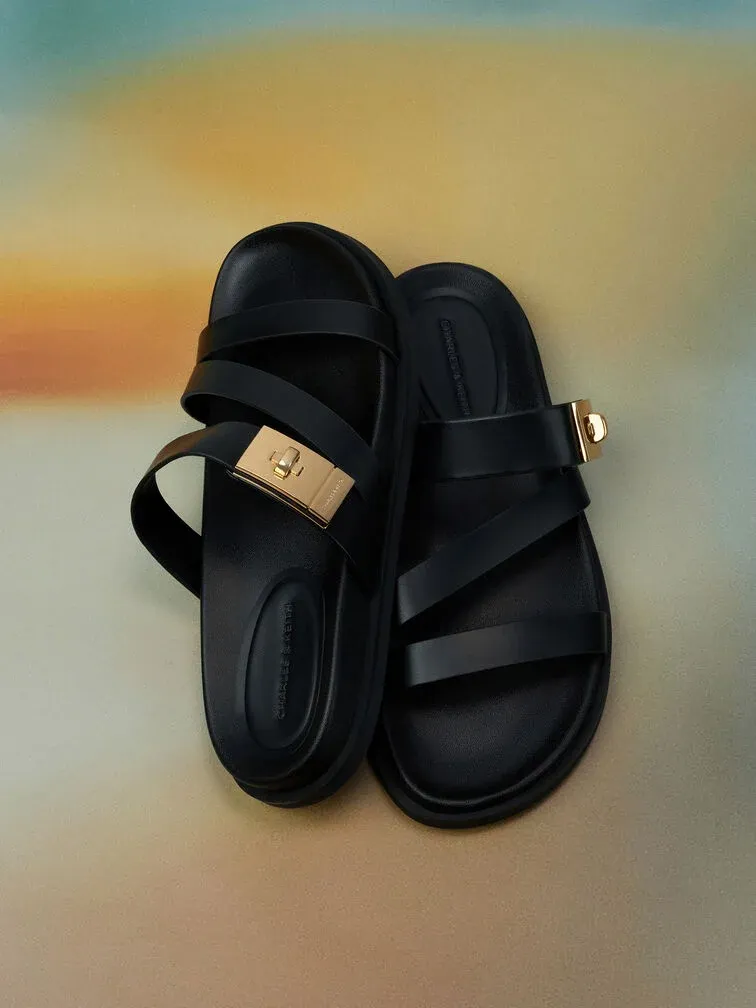 These Aelin strappy sandals in black feature a triple-strap design, polished gold-tone turn-lock buckles, open round toes and cushioned flat soles. They will elevate your weekend looks effortlessly with their relaxed-chic sophistication.