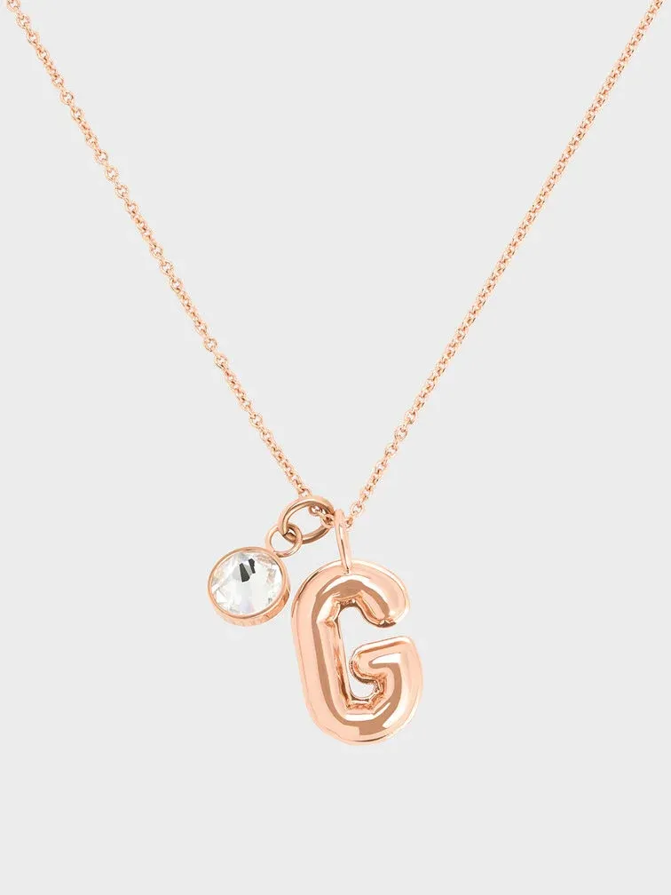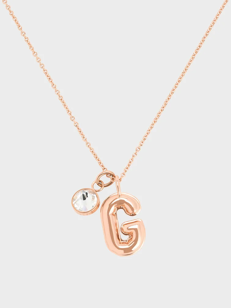 Personalise your look with an alphabet G charm pendant. Rendered in sweet rose gold, this pretty trinket can be used on necklaces or earrings to add just the right amount of sparkle to everyday ensembles. Consider pairing it with a classic chain necklace or classic hoop earrings for a personalised touch.