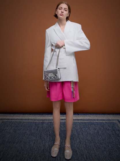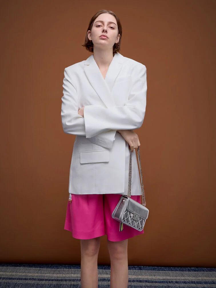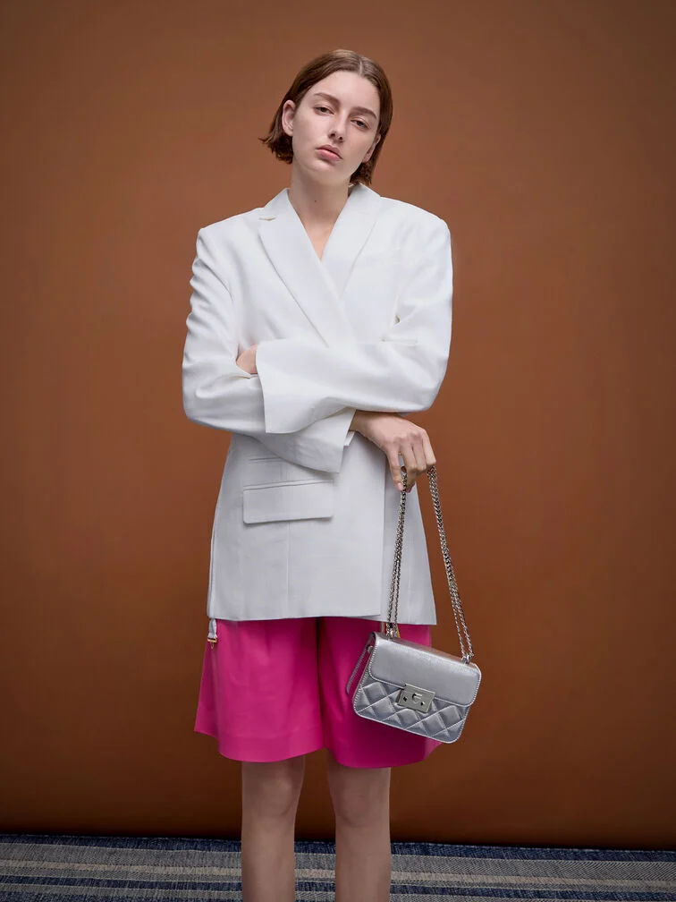 On nights out, the metallic Alva is the perfect way to make a statement. The shiny silver finish and hardware, along with the quilted texture, create a standout silhouette. To go hands-free, simply lengthen the chain strap to convert it into a crossbody bag.