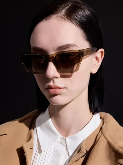If you are looking for stylish yet utilitarian sunglasses, this pair in khaki is a great option. They feature a sleek, angular frame that has a sharp, polished aesthetic. The gold-tone emblems on the see-through temple arms also add a distinctive touch to the design. These tinted sunglasses have a timeless appeal that will never go out of style.