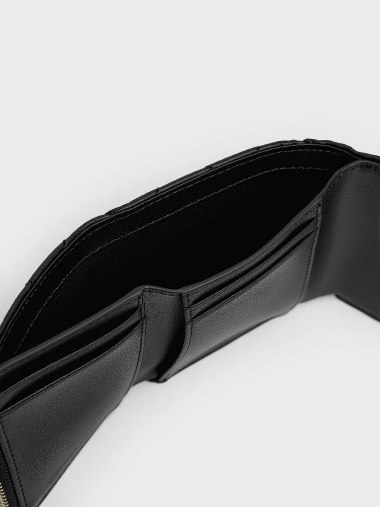 This Arrietty wallet in black features a quilted finish, shiny heart and bow charms, a curved front flap and a magnetic closure. It will brighten up your everyday routine with with its soft structure and pretty details.