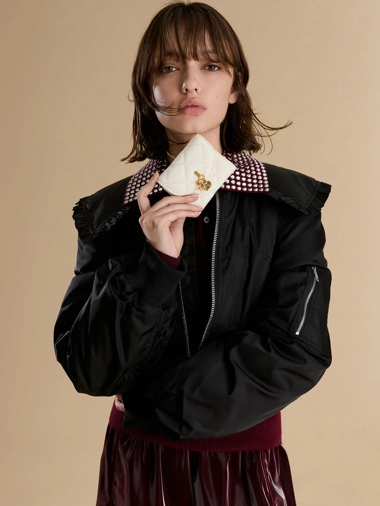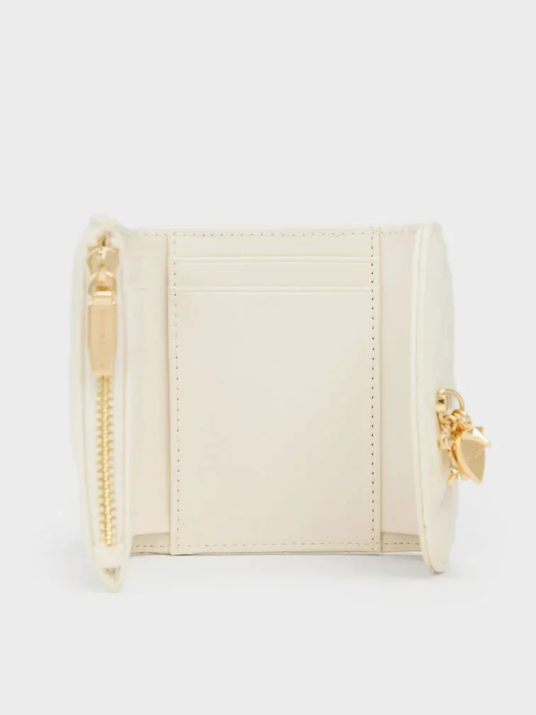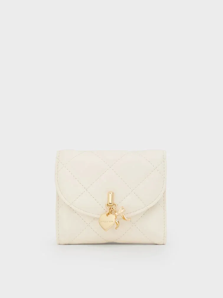 This Arrietty wallet in cream features a quilted finish, shiny heart and bow charms, a curved front flap and a magnetic closure. Slip this pretty and practical piece into your everyday bag and show it off during lunch breaks and errand runs.