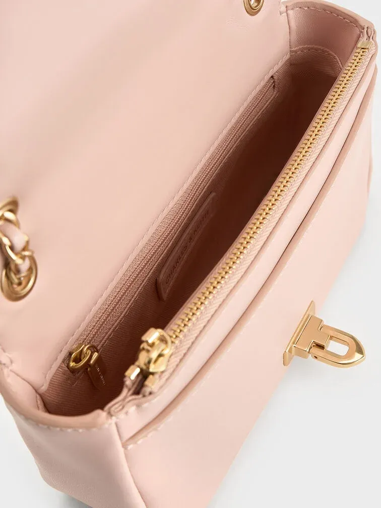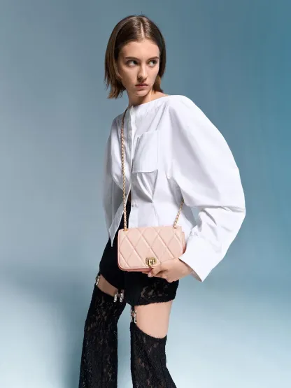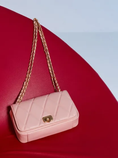 This diamond-quilt shoulder bag is the latest addition to our Arwen family. Featuring a spring-friendly light-pink finish, it will make a lovely addition to your new seasonal wardrobe. The turn-lock closure, a signature feature of the Arwen, adds an eye-catching detail to the classic design.