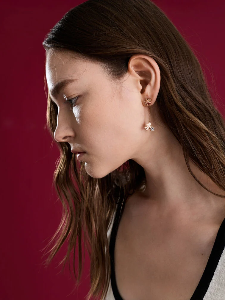 These Athalia earrings in rose gold feature gingerbread-fairy motifs, crystal stars and a chain-drop design. Use them to add playful festive charm to your look while keeping a polished aesthetic.
