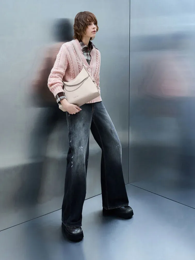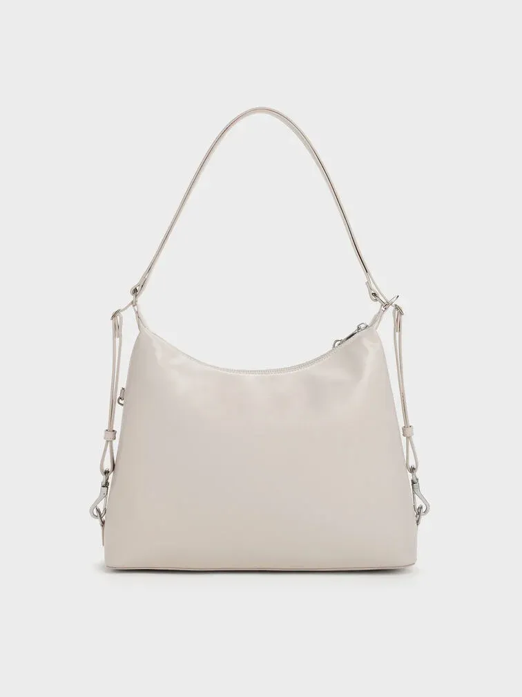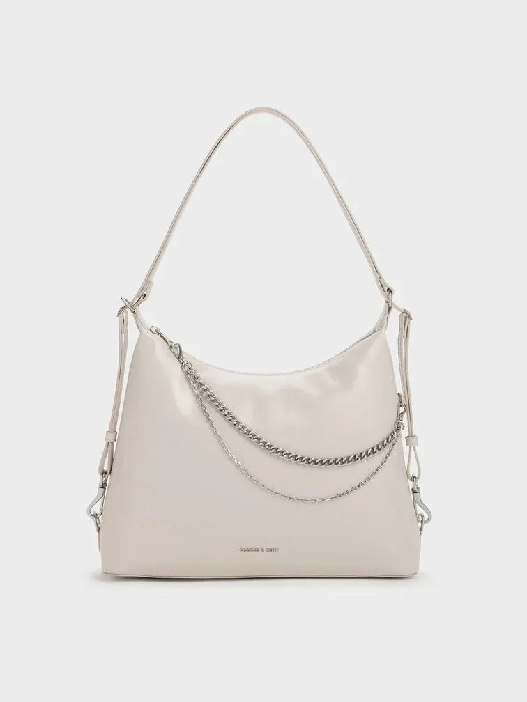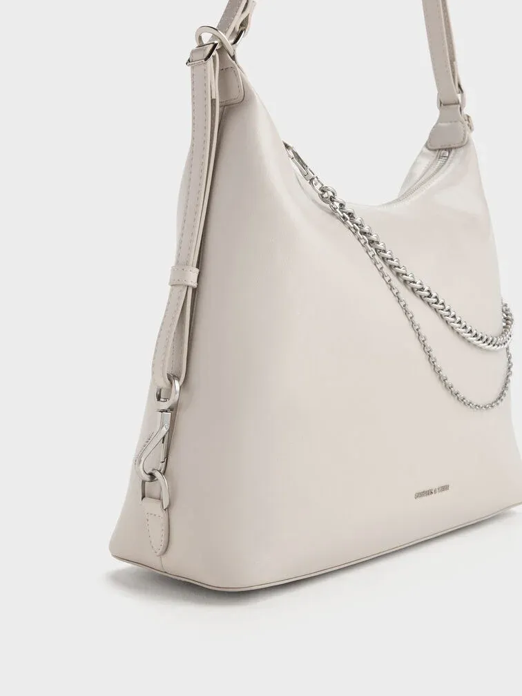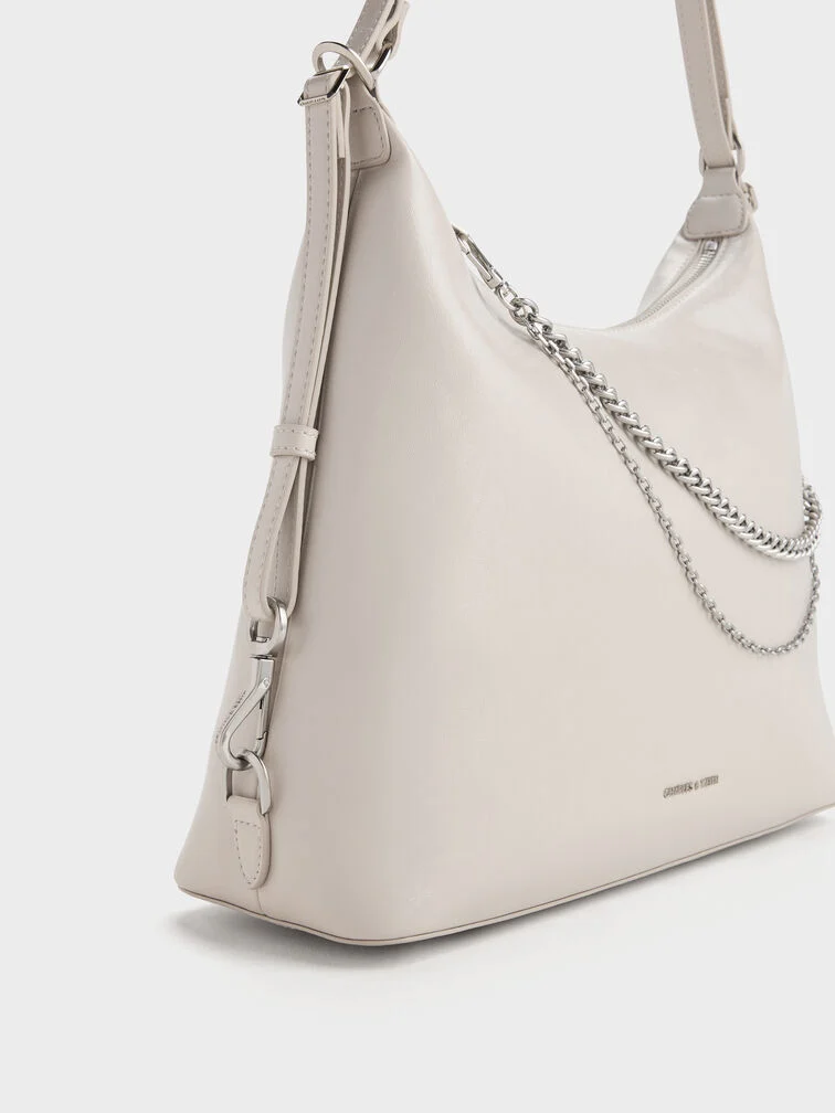 This Atwood hobo bag in shell grey features a chic distressed finish, double-chain embellishments, a buckled adjustable strap, and a top-zip closure. It also comes with a detachable shoulder strap. Use it to elevate your everyday ensembles with a touch of sophistication.