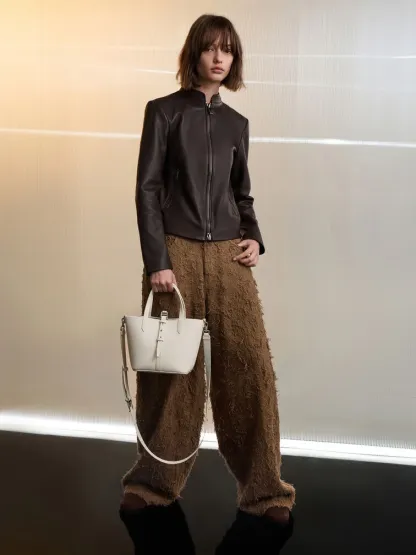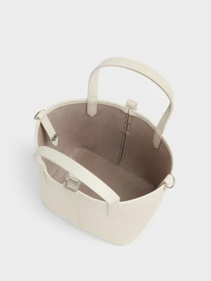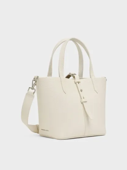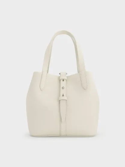 This Beryl bucket bag in cream features a double-handle belted design. Match it to monochromatic looks for an effortlessly crisp aesthetic that carries you through busy days with an air of thoughtful sophistication.