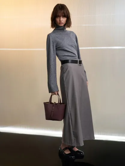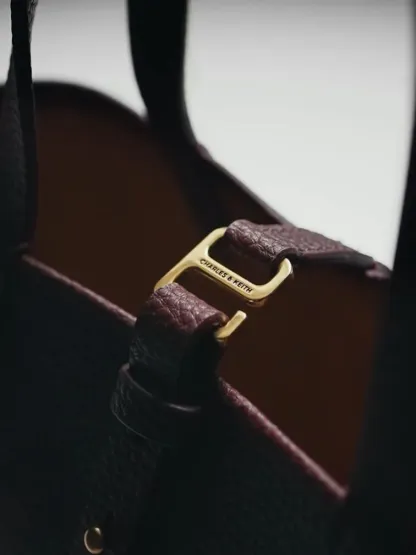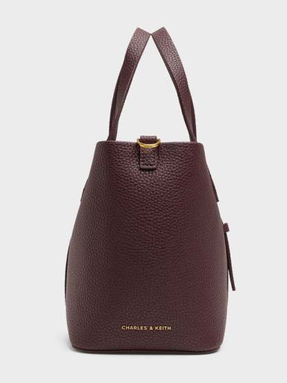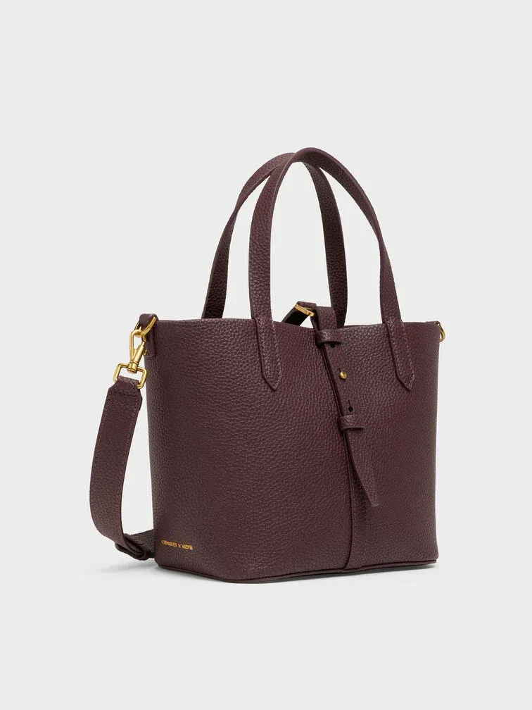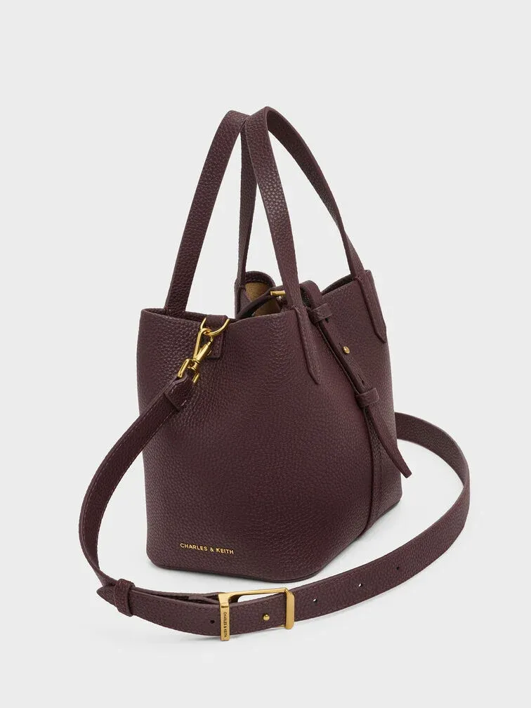 This Beryl bucket bag in wineberry red features a double-handle belted design. Carry it with relaxed blazers and cropped trousers for an edit that is casually polished and effortlessly adaptable.
