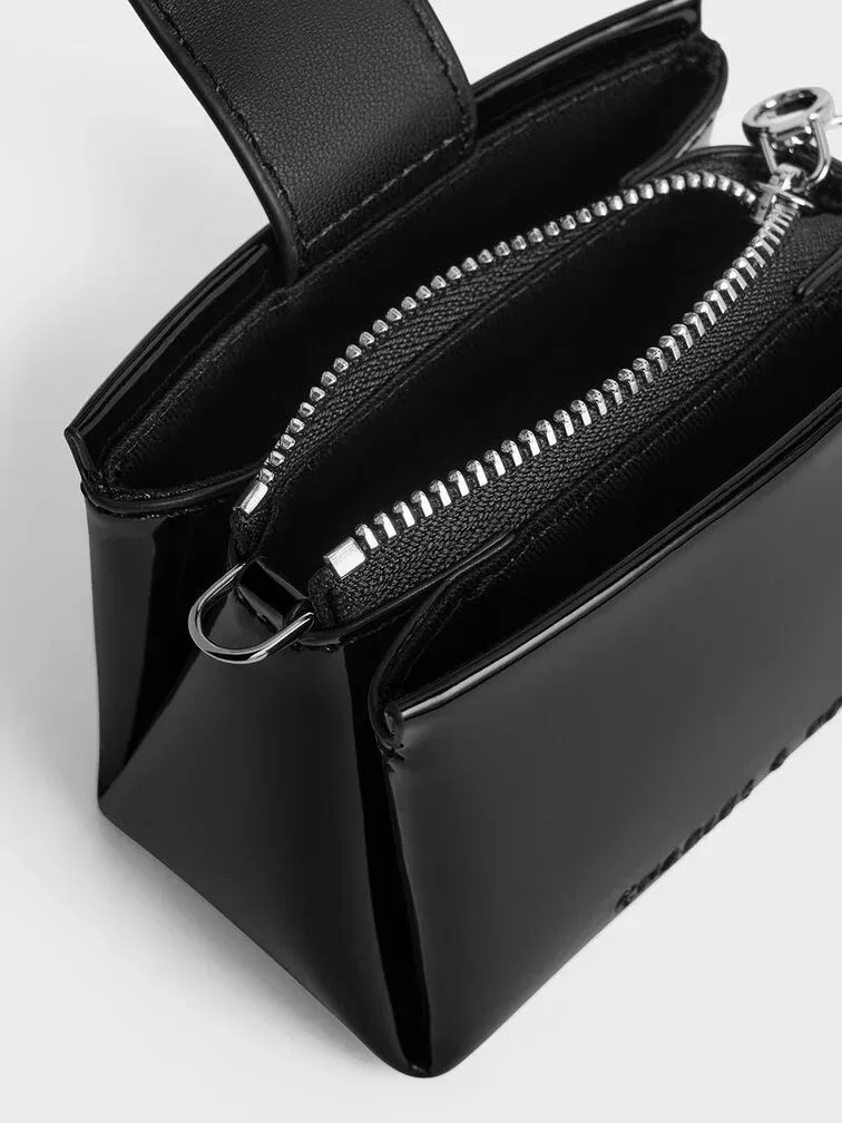 Compact and chic, the Bosie pouch is designed for effortless style. Featuring a single top handle, it is perfect for carrying by hand and will add a touch of dainty elegance to any outfit. Its petite size makes it ideal for quick errands or minimalist travel. The secure magnetic closure will keep your small essentials safe and easily accessible, while the patent finish adds a glamorous shine.