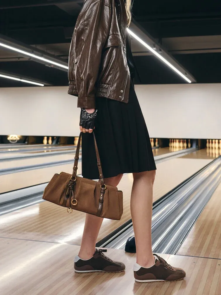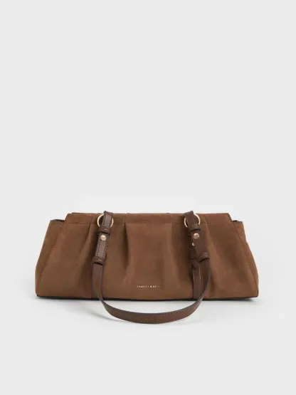 This Britton shoulder bag in mocha brown features an east-west silhouette, elongated shoulder straps, a ruched finish and a detachable keychain. Carry it to refine flowy skirts and crisp shirts, creating a look that will bring you through the day in style.