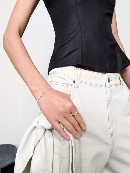In shiny silver, this Corrine pearl chain-link double ring is feminine and edgy at the same time -- it will add subtle flair to both everyday outfits and special-occasion ensembles. The various contrasting elements of this piece -- from the sculptural lines of the solid band to the movement of the pearl-lined chain-link band -- come together to create a visually stunning design that will be sure to start conversations.