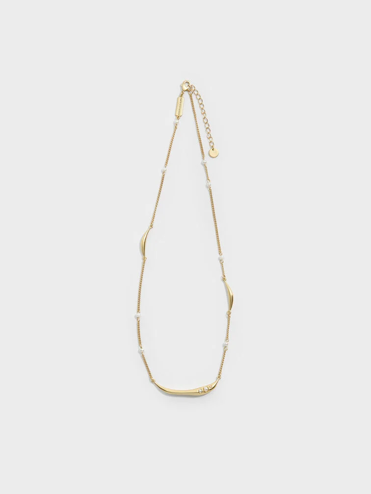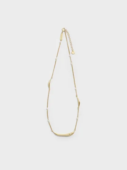 This necklace features a sculptural centrepiece embellished with elegant pearl accents. Fine chain links, metallic bars and additional pearls are interspersed throughout, brought together by an understated brushed gold finish.