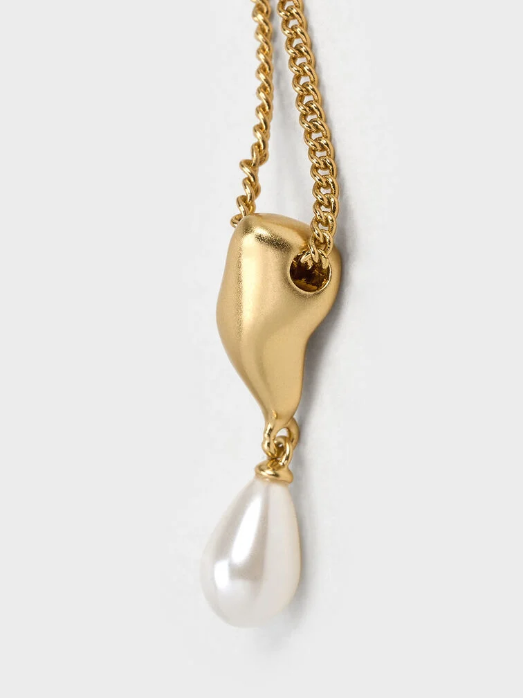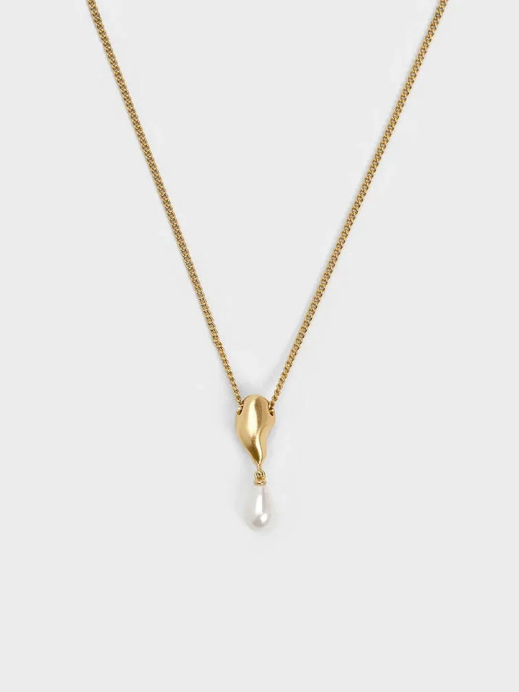 As pearls are having a moment right now, this Corrine teardrop pearl necklace is the perfect piece to add to your jewellery collection this season. Elegant and understated, it features a single teardrop-shaped faux pearl that hangs off a sculptural gold-tone pendant. The smooth curves of the pearl is juxtaposed against the fluid lines of the pendant -- the result is striking and sophisticated.