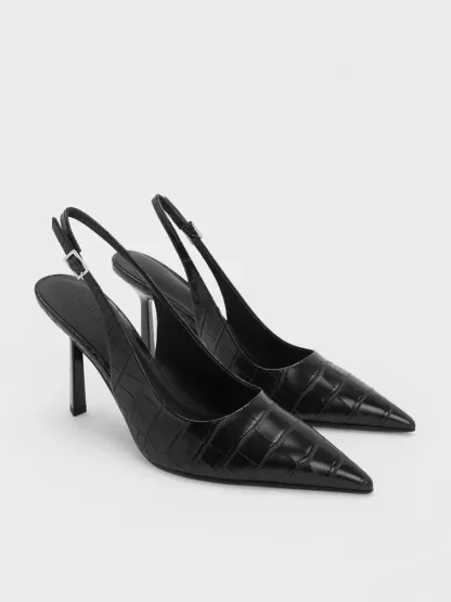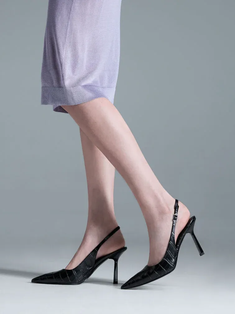 Classic black heels just got even better with a croc-effect finish that will add tasteful tactility to any look. Complete with adjustable slingback straps and sleek stiletto heels, these pumps will have you looking all ready and put together the moment you put them on.