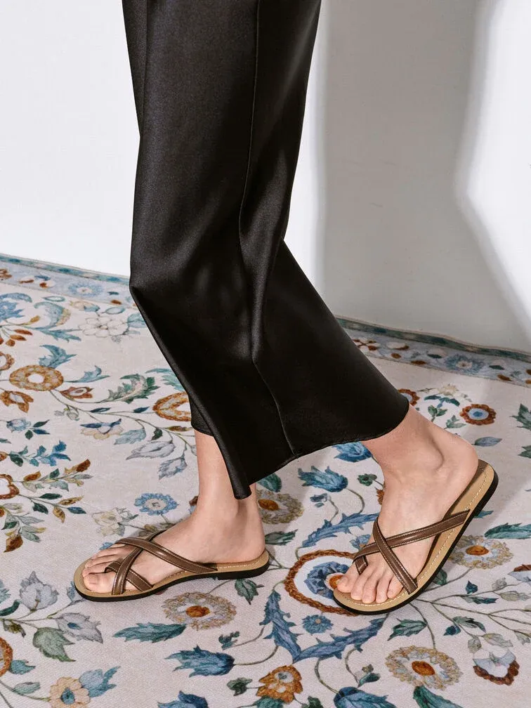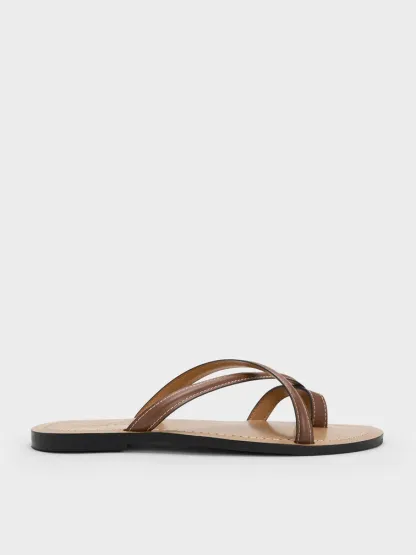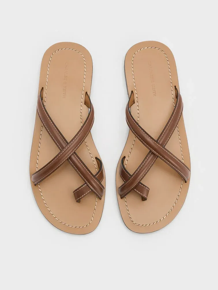 These sandals in cognac feature a minimalist design, crossover straps, trendy toe-ring details, elegant stitched trims, round toes and flat soles. Match them with casual separates to add warm colour to relaxed outfits.
