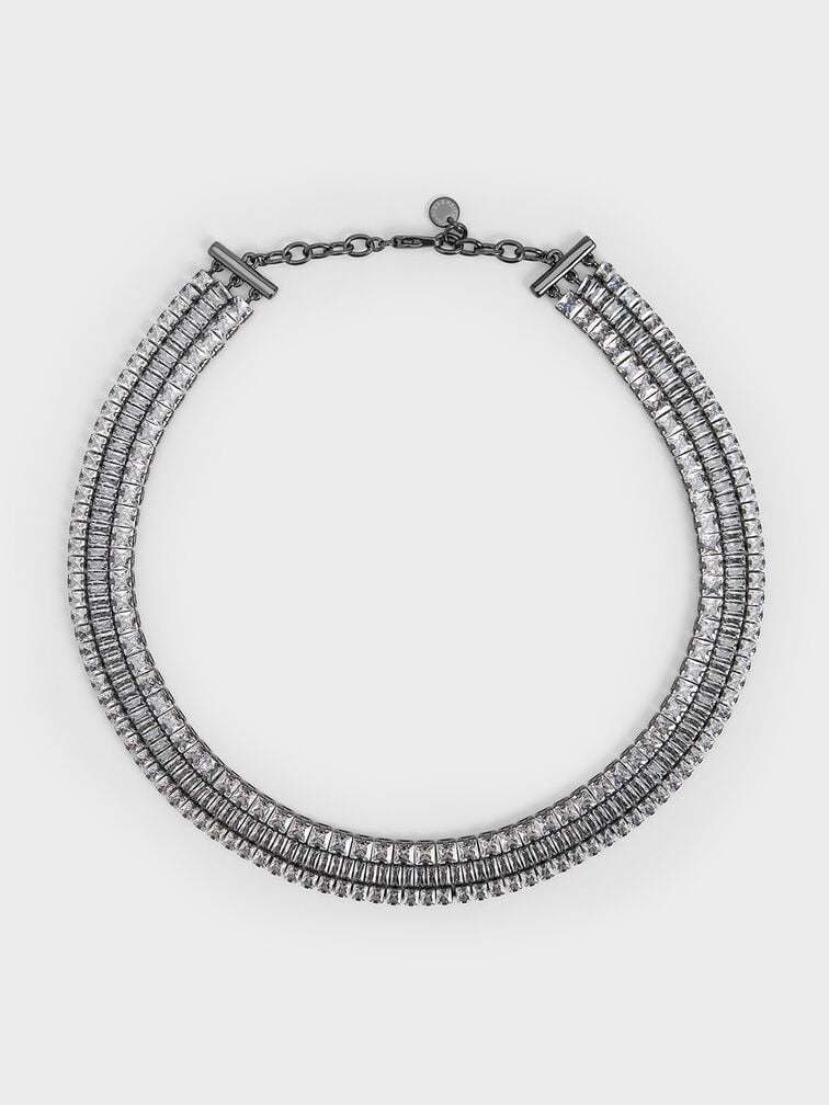 Featuring not one, not two, but three rows of sparkling crystals, this tennis necklace will add eye-catching brilliance to any outfit. Perfect for pulling out all the stops during the festive season, its tonal black hardware and matching baguette-cut crystals offer a seamless glisten. The secure lobster clasp ensures ease of wear, letting you stand out effortlessly on a crowded dance floor.
