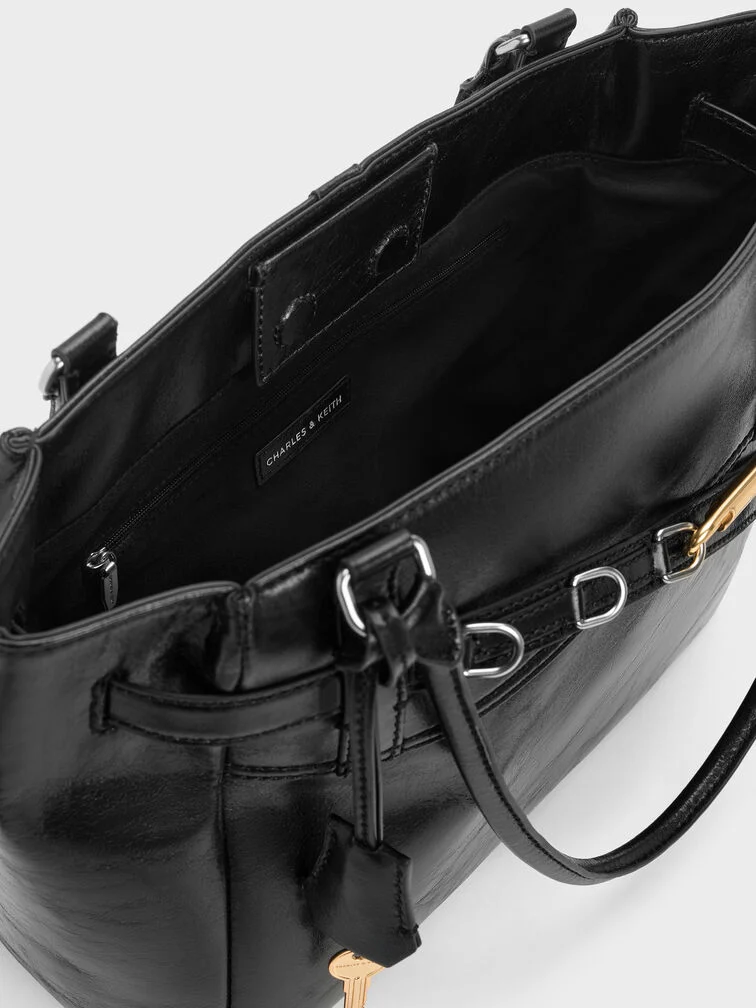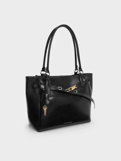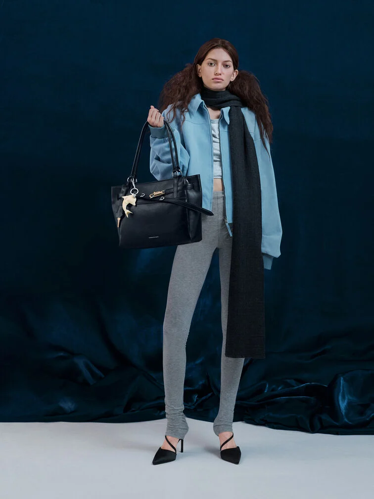 This Delfina tote bag in black features a slouchy construction, a roomy interior, a chic belted design with a lock-buckle detail, double handles, a magnetic closure and a detachable keychain. Carry it with modest silhouettes to maintain a refined aesthetic through office hours and beyond.