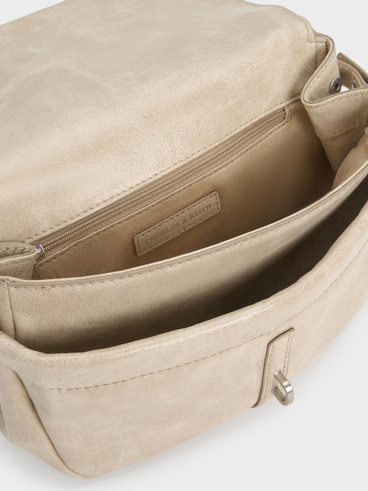 This Delfina crossbody bag in sand features a front-flap design, an edgy chain detail, a lock-buckle closure, an adjustable buckled strap, and a detachable keychain. Use it to introduce gentle structure to laid-back daywear combinations.