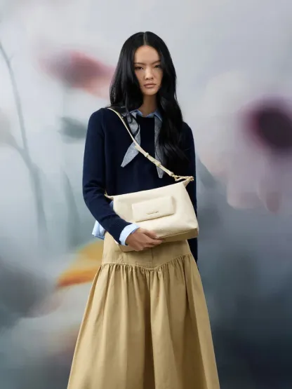 This Duo hobo bag in cream features a quilted design, a front pocket, a braided-chain shoulder strap and a spacious main compartment that is secured by a zip closure. It will complement tailored separates with its distinctive crinkle-effect texture and softly structured shape.