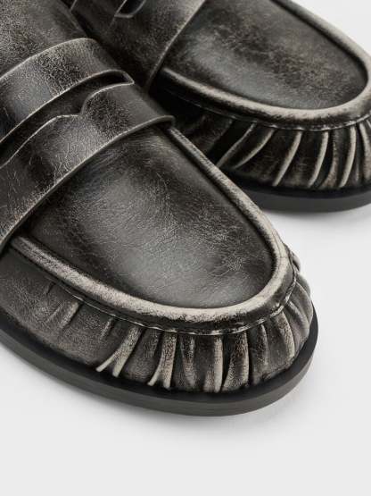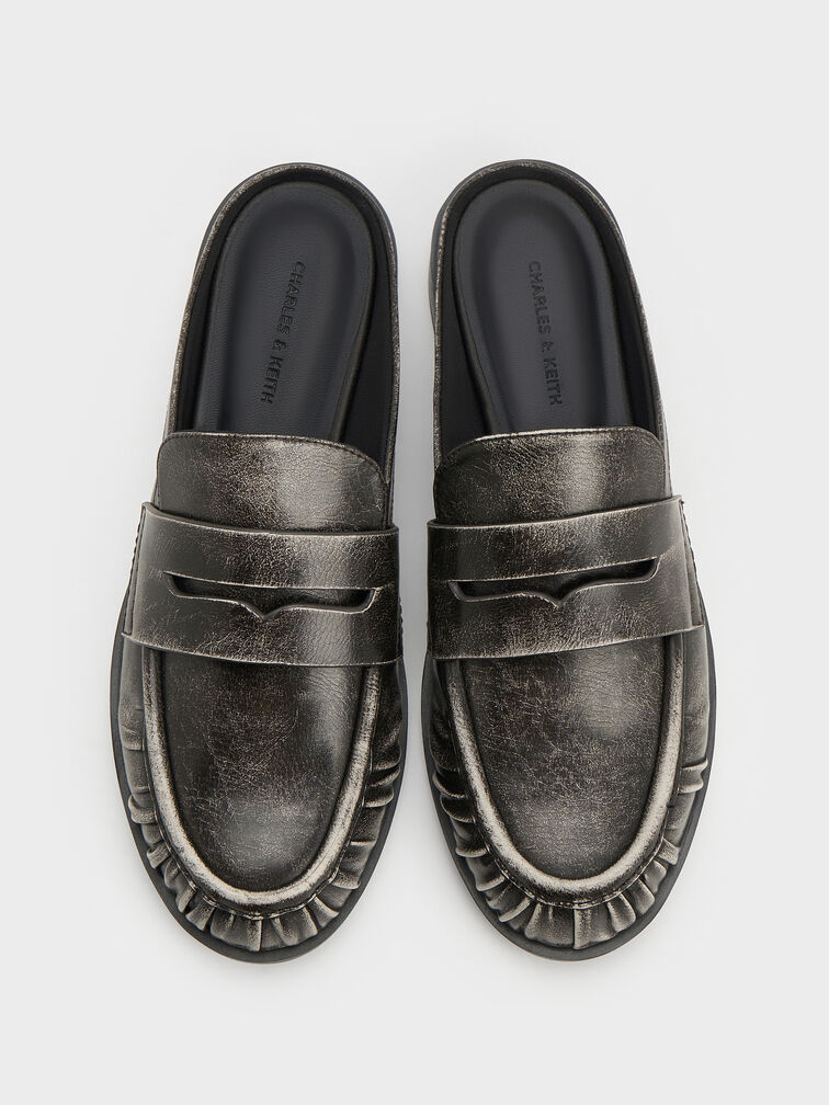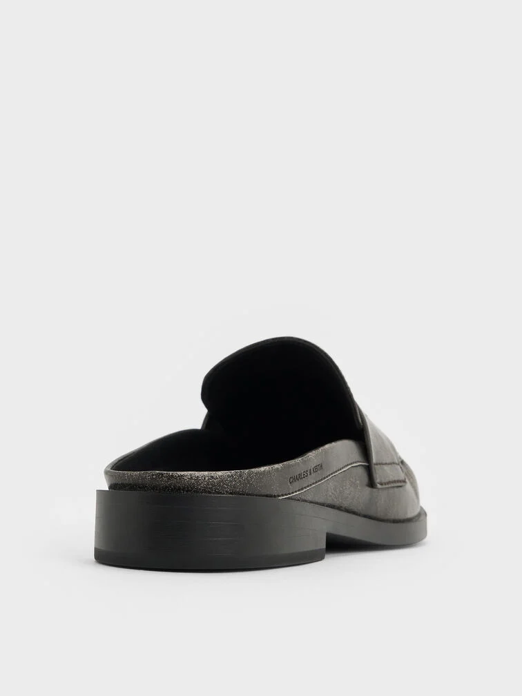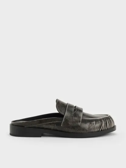 These Dylan loafer mules in grey feature a burnished finish, ruched detailing, classic penny straps, almond toes, and a slip-on design. Wear them with your favourite jeans and structured tops to achieve an effortlessly cool off-duty aesthetic.