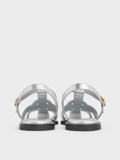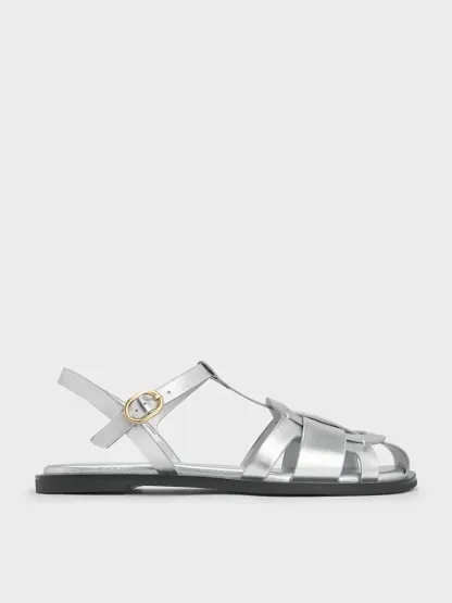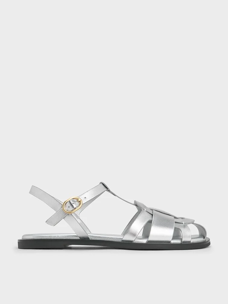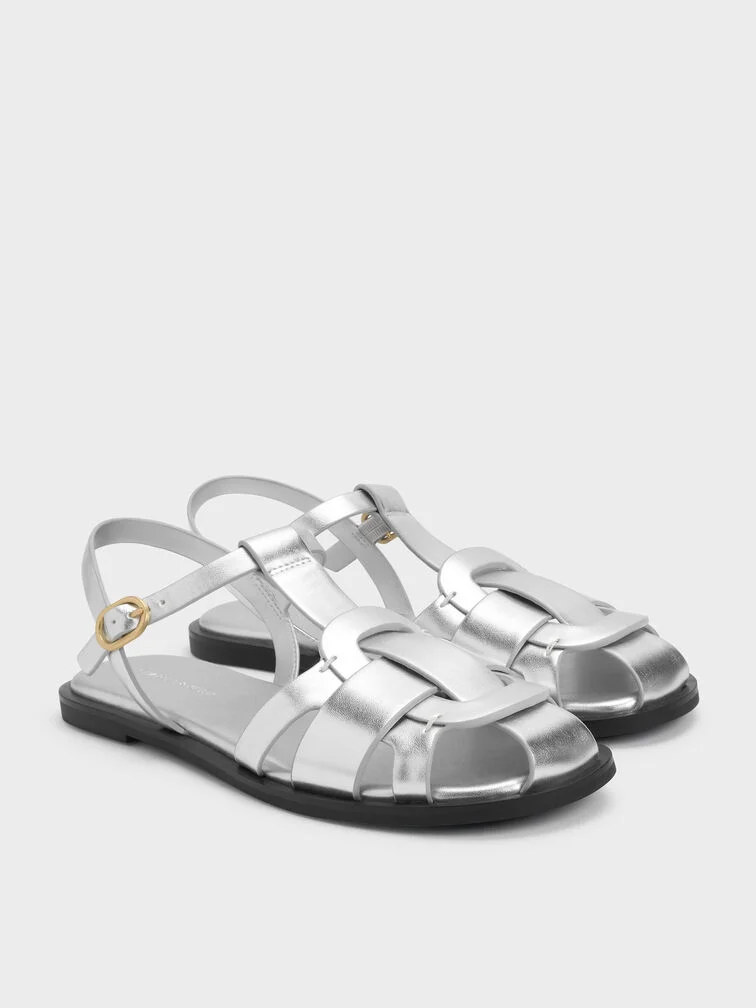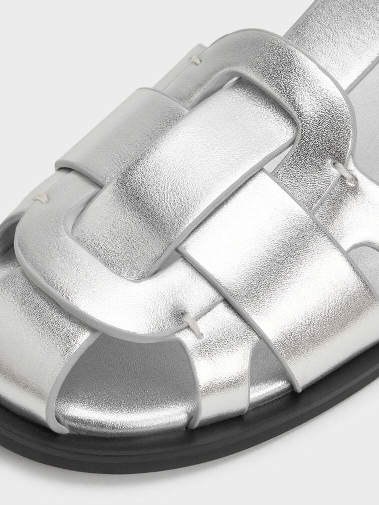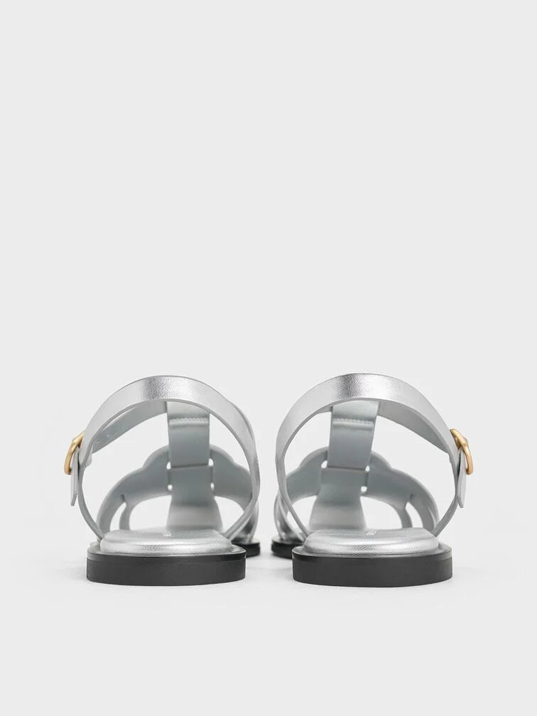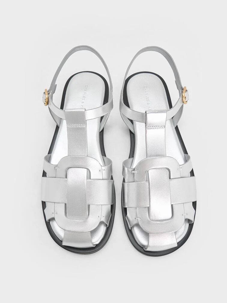 Bring a little more edge to your warm-weather looks with these caged sandals in metallic silver. Not any less versatile, their classic interwoven design will weave elegance into any outfit while adding a hint of shimmer and shine.