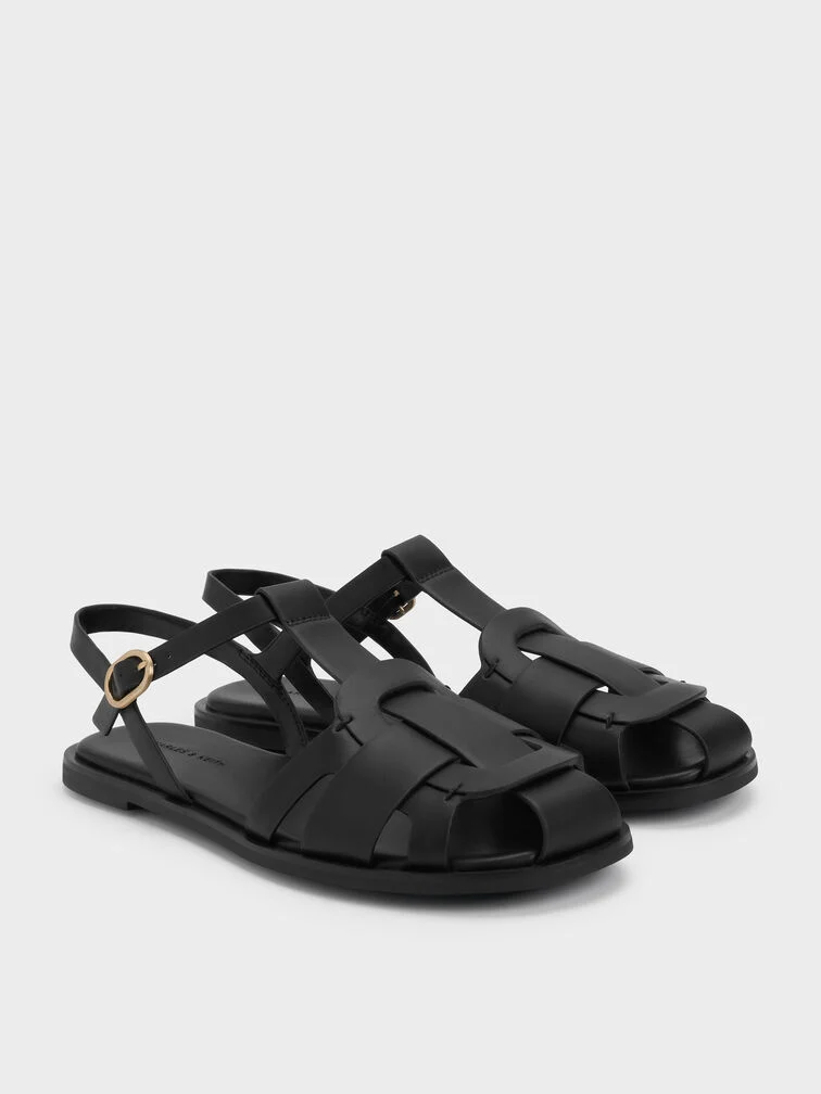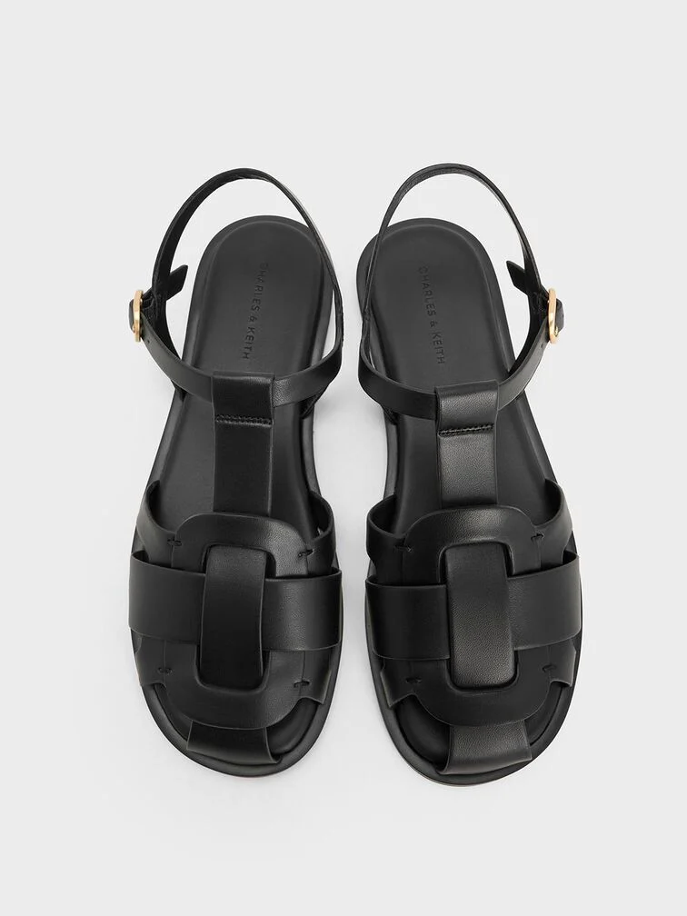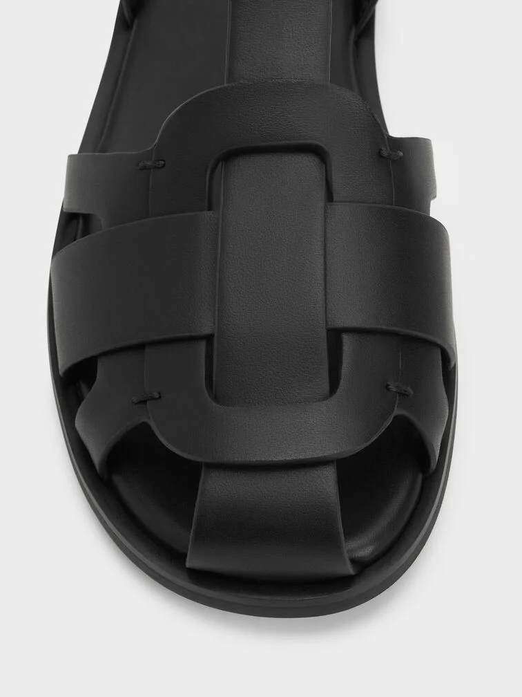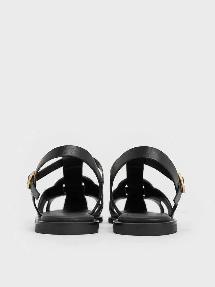 Caged sandals are a great style option for the warm-weather seasons. Our version, in timeless black, will complement a wide range of outfits, offering endless versatility. They also provide a secure fit, thanks to their adjustable ankle straps. Pair these caged sandals with classic white crew socks for a cool-girl look.