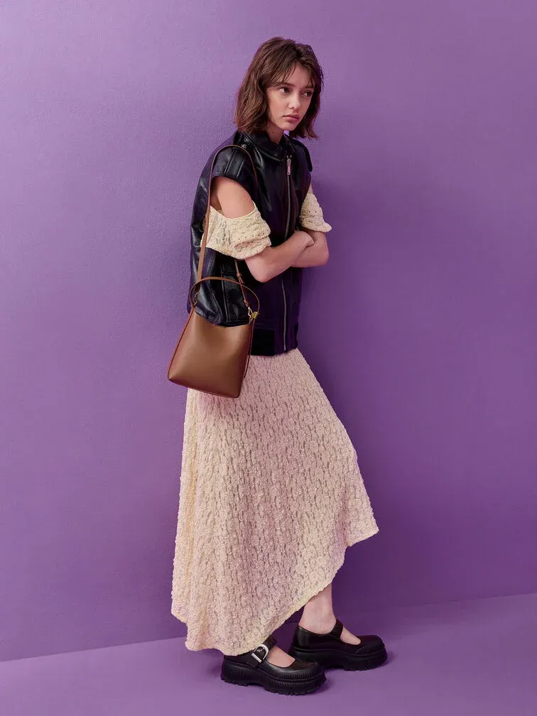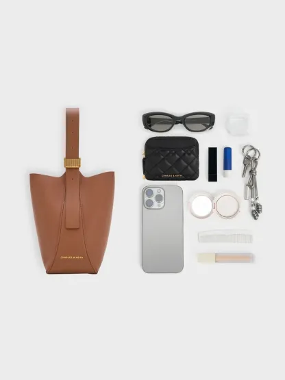 This Edna bucket bag in chocolate brown features a softly structued silhouette, an adjustable top handle and a magnetic closure. It also comes with an additional zippered pouch that can be used separately. Use it to ground relaxed tailoring with stylish minimalism.