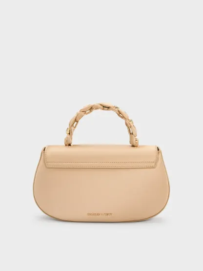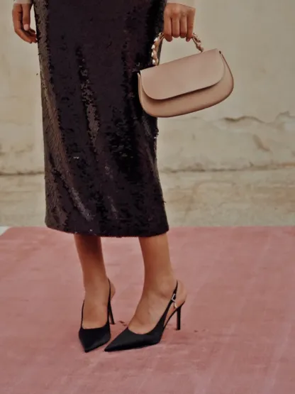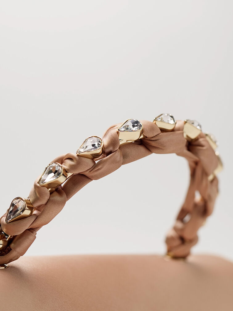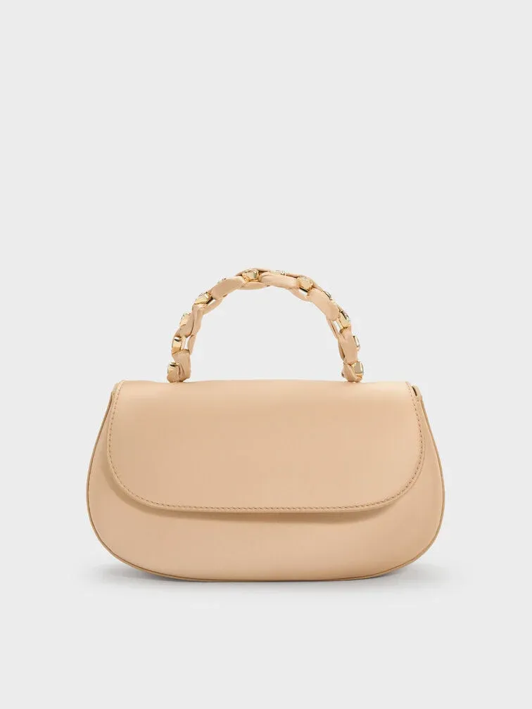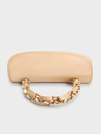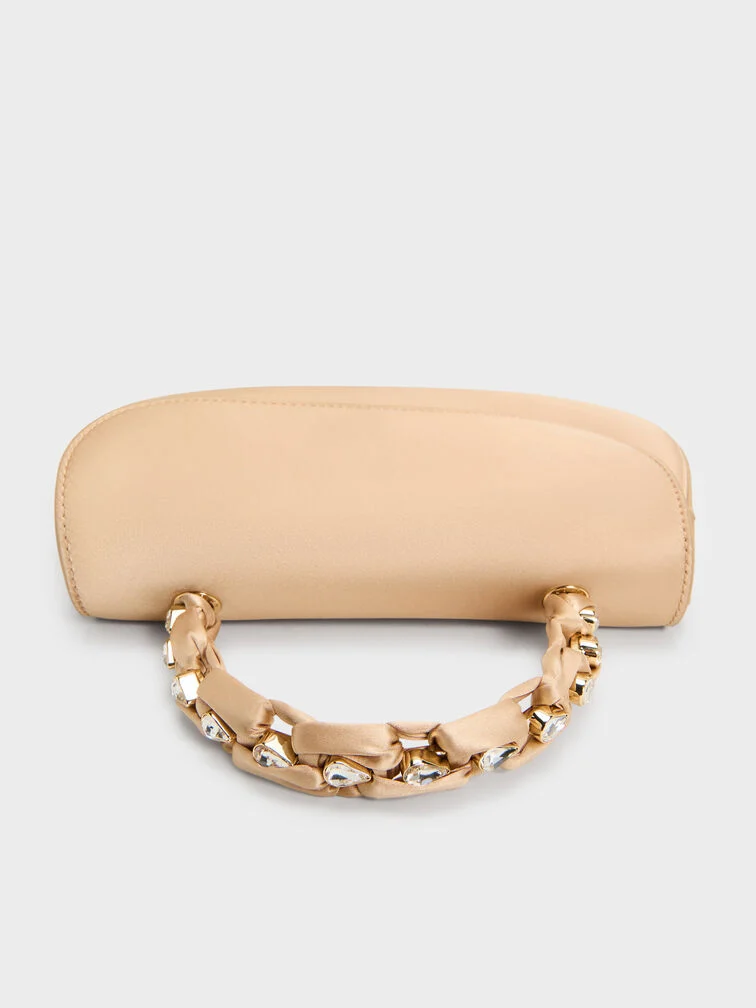 This Eilian bag in champagne is made with satin and features a gem-embellished braided top handle and an elegant half-moon silhouette. It also comes with a detachable chain-strap so you can use it as a crossbody bag.