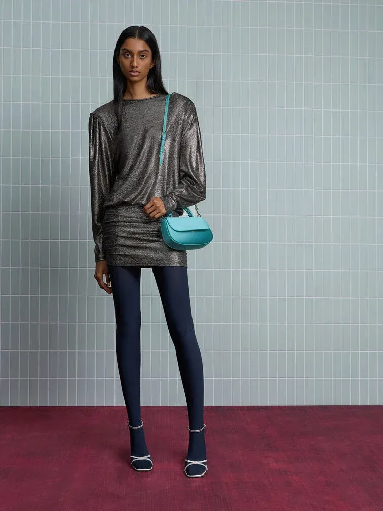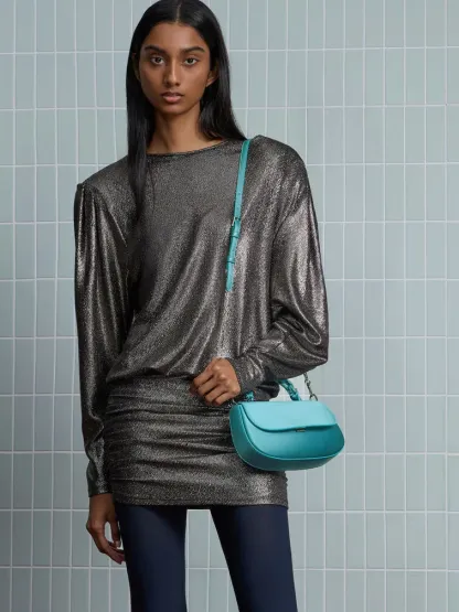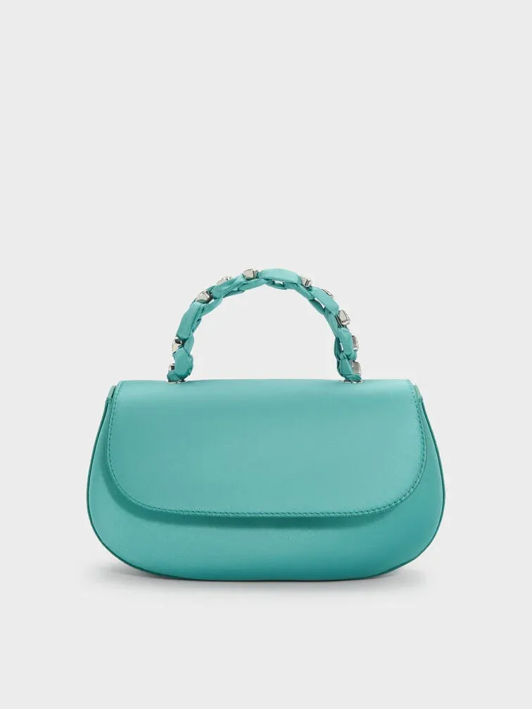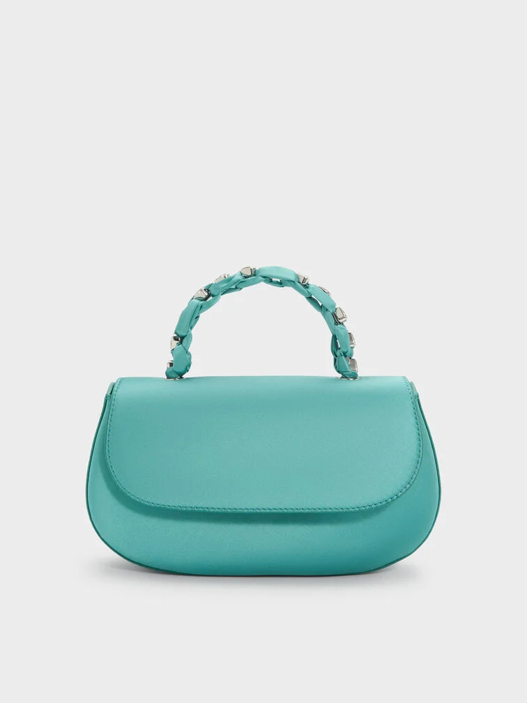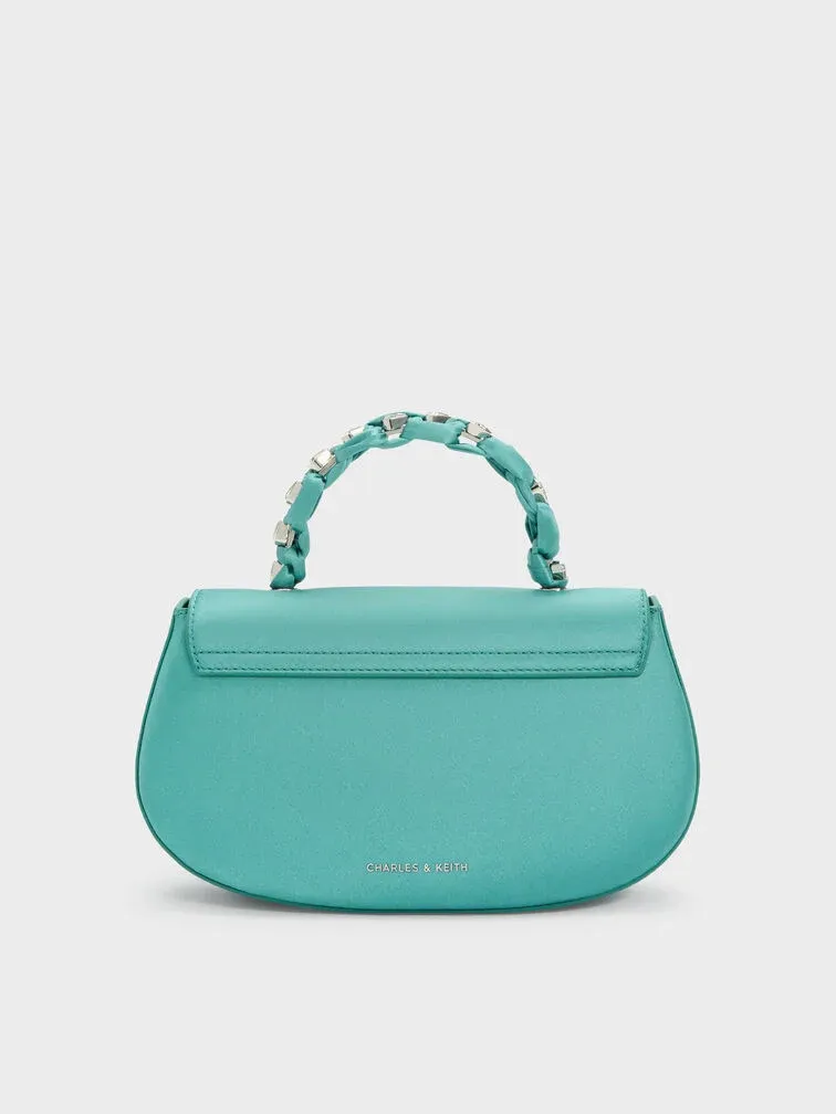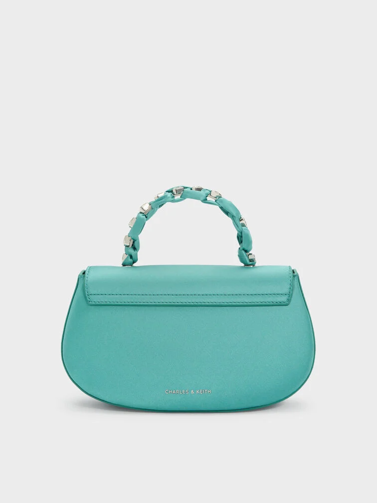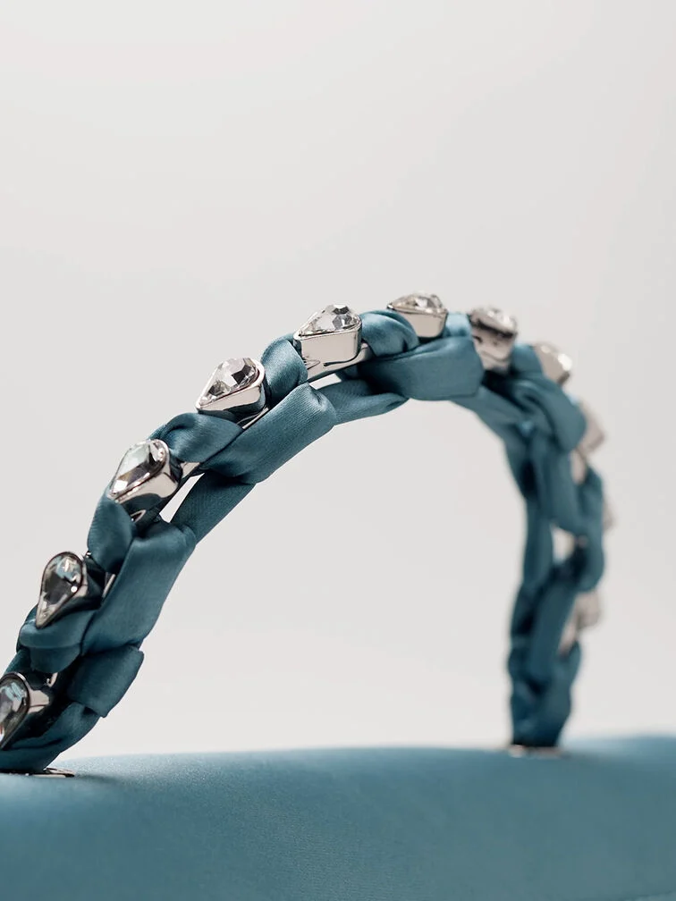 This Eilian bag in teal is made with satin and features a gem-embellished braided top handle and an elegant half-moon silhouette. Let it add rich colour and refined elegance to your dressy evening outfits.