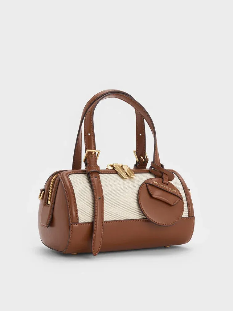 Bowling bags are having a moment -- this Enola piece definitely deserves as spot in your bag collection. Smooth chocolate-brown faux leather is contrasted with the rough texture of beige canvas to create a warm, neutral-tone design. Featuring adjustable double-handles and a detachable keychain, this bag is as functional as it is stylish.