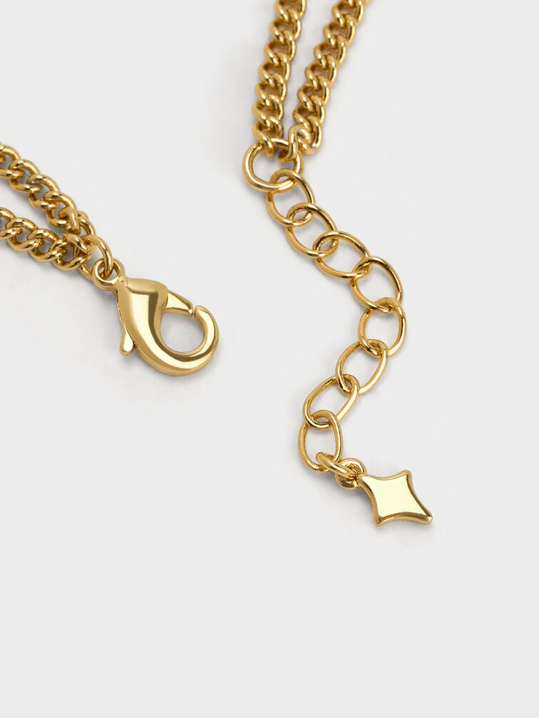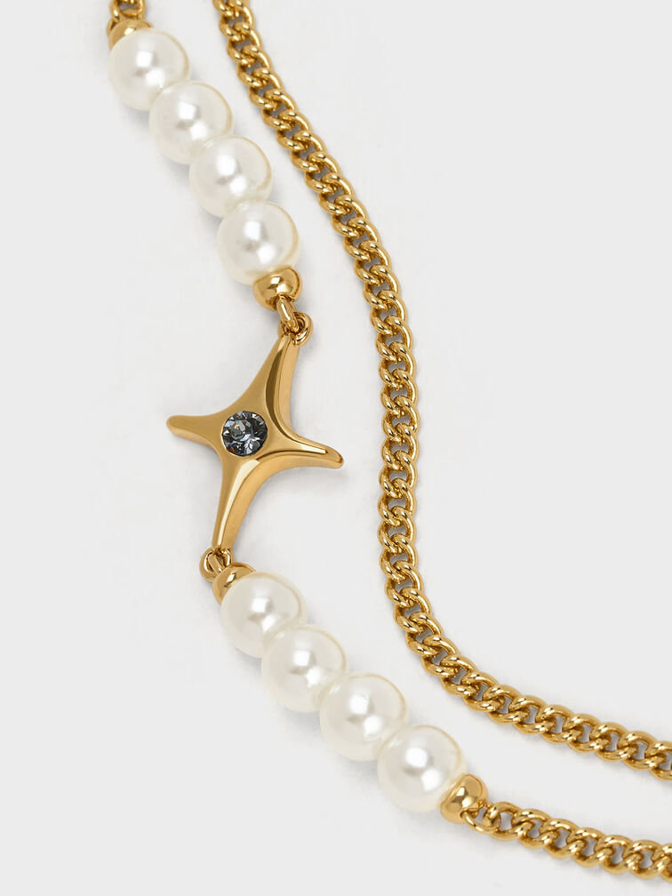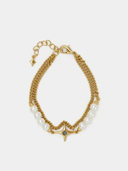 This Estelle bracelet has a double-chain design. It is adorned with lustrous faux pearls and feature a striking 4-point star pendant that is embellished by a black crystal. Wear it on its own or pair it with other star-motif jewellery to create a coordinated look.