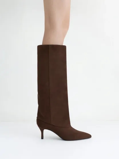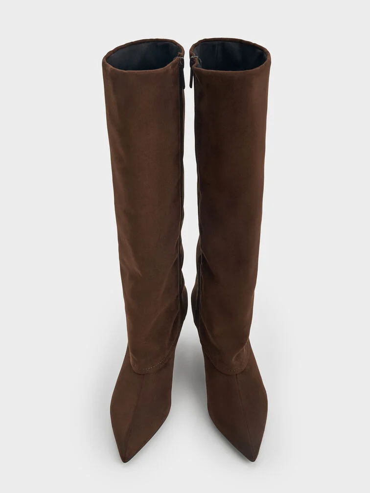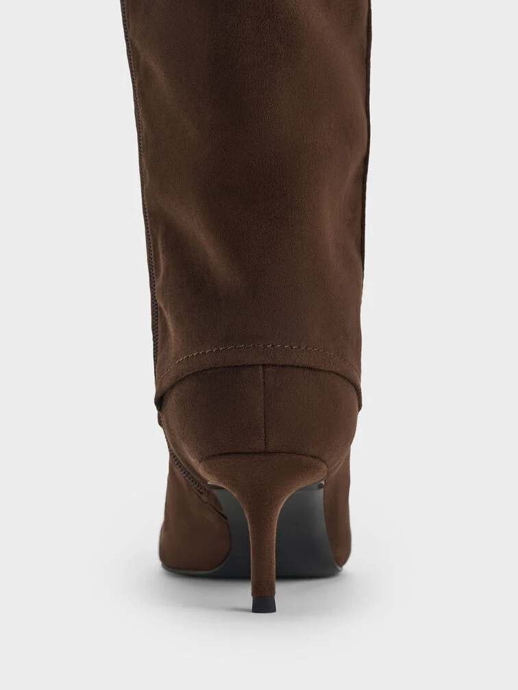 Faux Suede Pointed Stiletto Knee-High Boots - dark brown textured