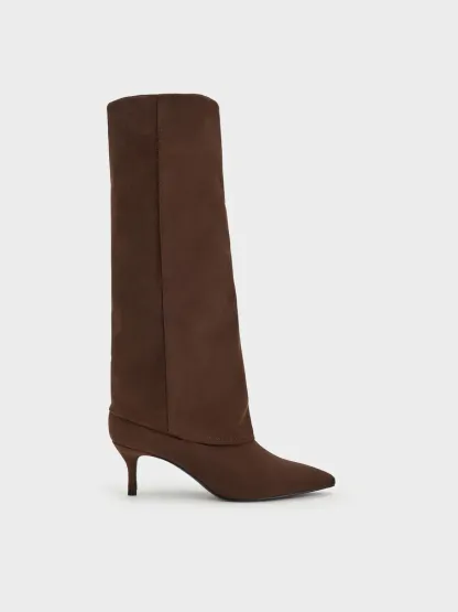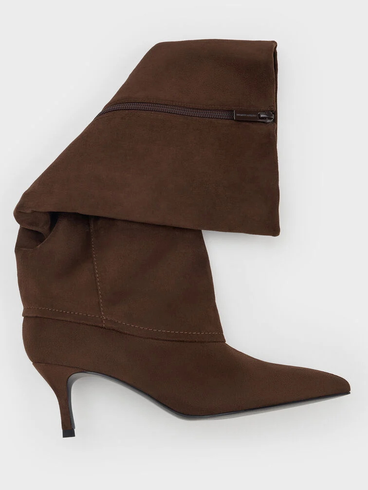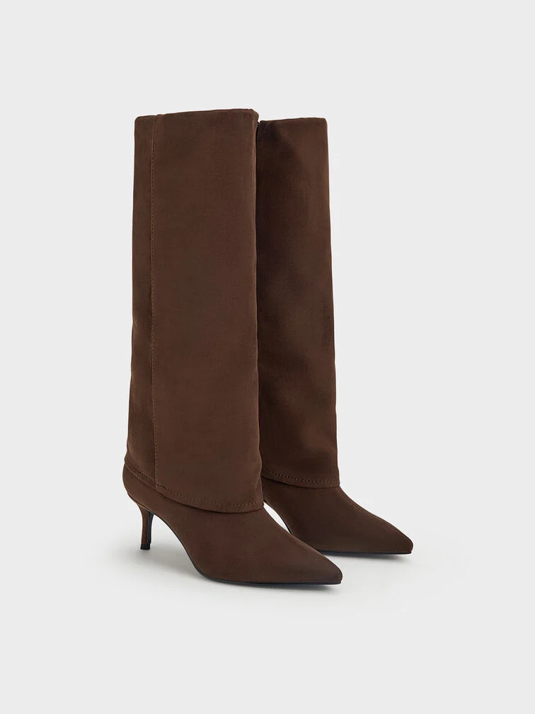 These knee-high boots in dark brown are made with faux suede and feature pointed toes, stiletto heels and sleek shafts. Wear them to add definition to layered neutrals and knits during in-between seasons.