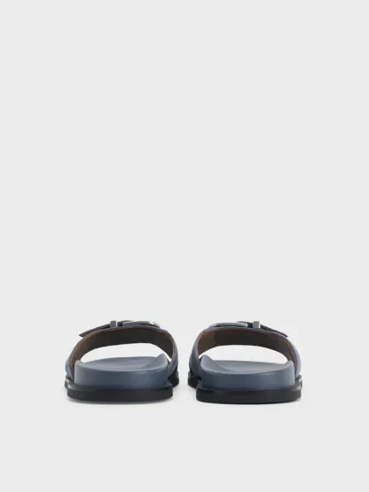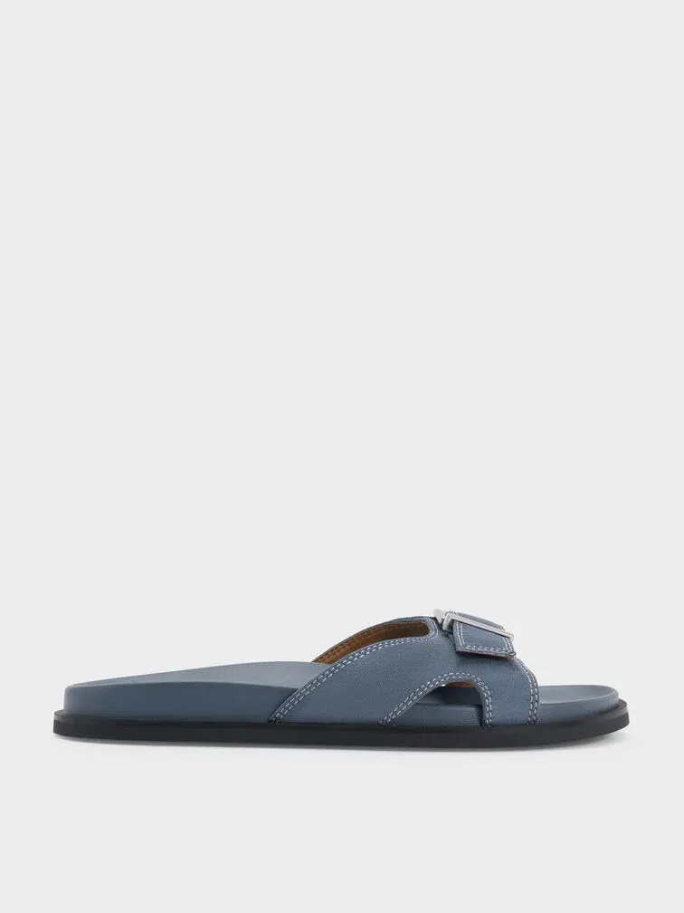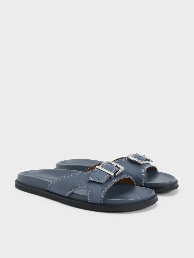 Faux Suede Stitch-Trim Buckled Slides - blue
