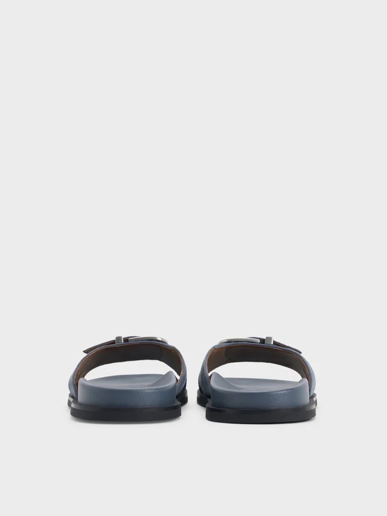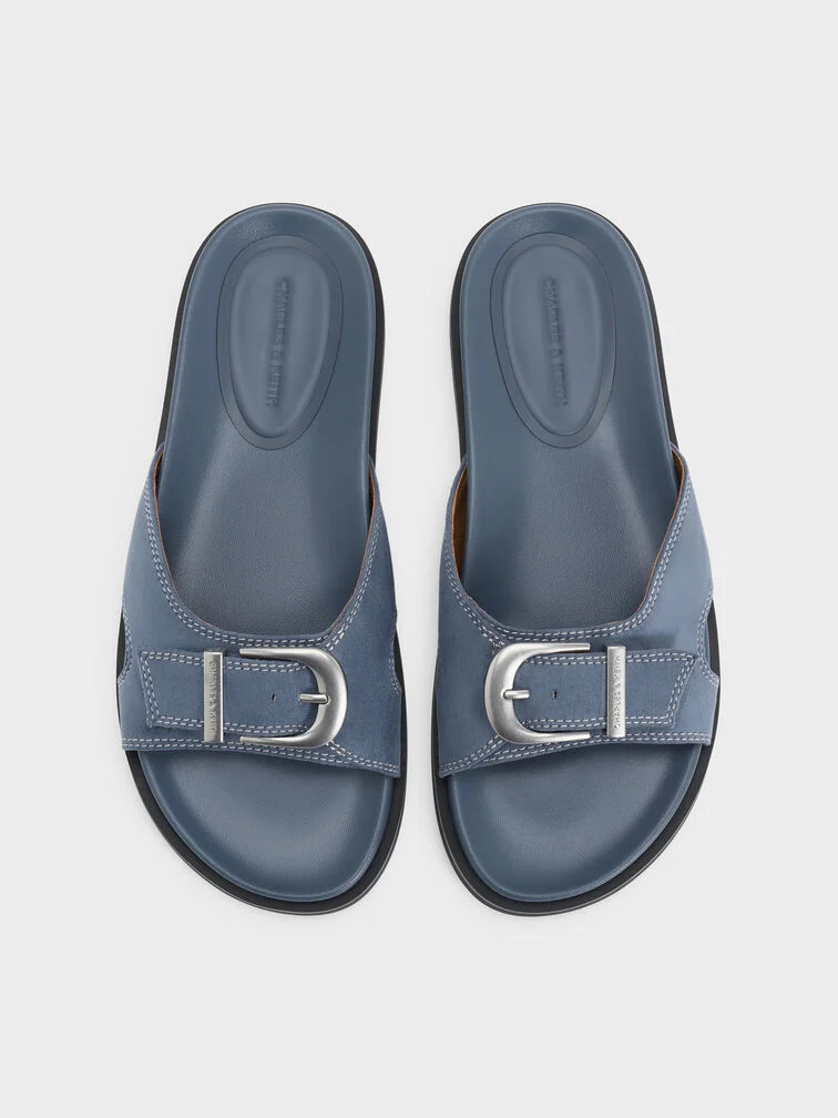 These slide sandals in blue are made with faux suede and feature a minimalist design, stylish stitched trims, cut-out details, bold buckles and supporitve footbeds. They will complement stylishly pared-back looks that are perfect for the weekends.