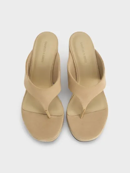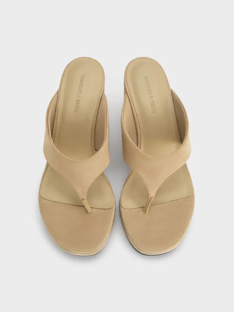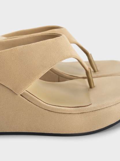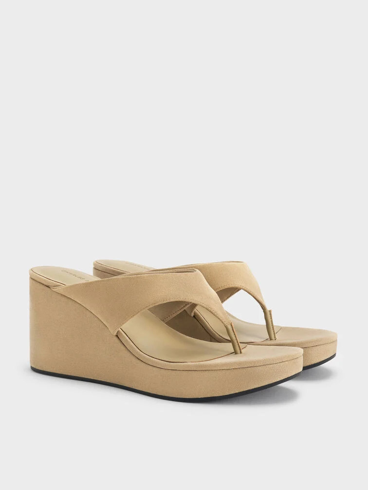 These thong sandals in beige are made with faux suede and feature platform wedge heels, gently rounded toes and a clean-lined, minimalist design. Pair them with your favourite summer dress for a chic, effortless look.