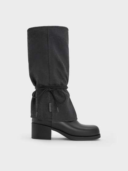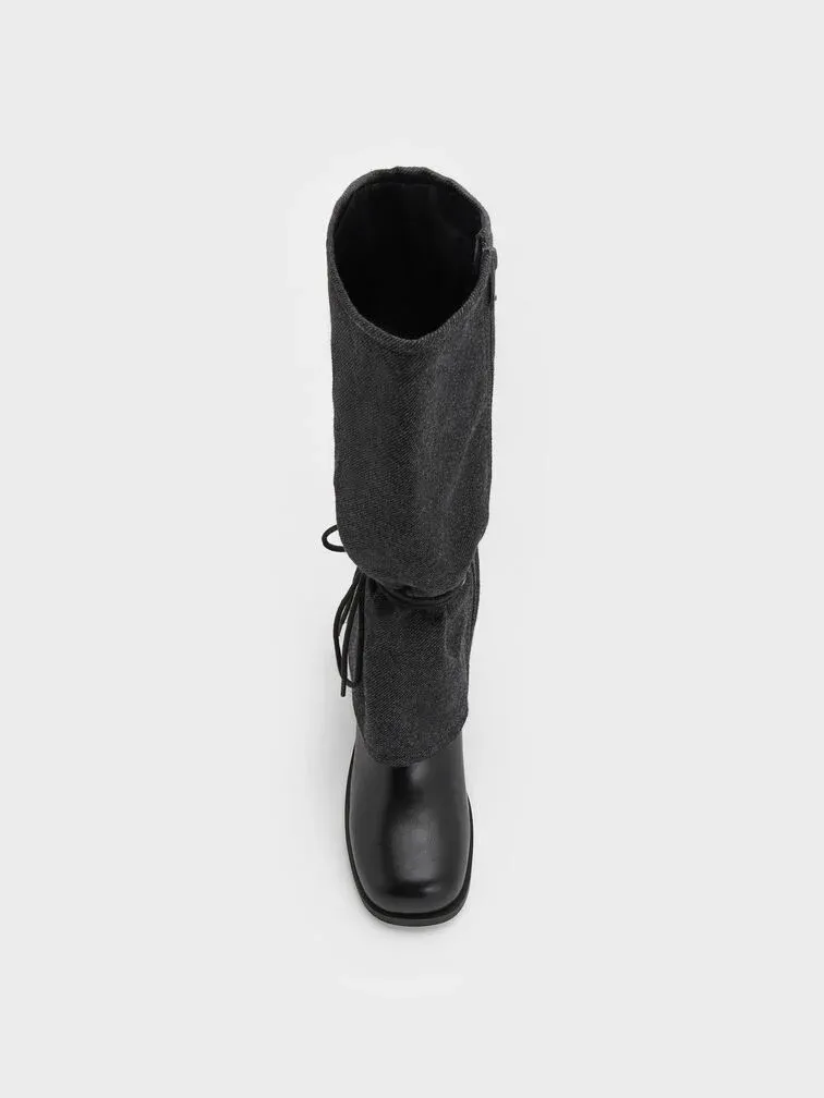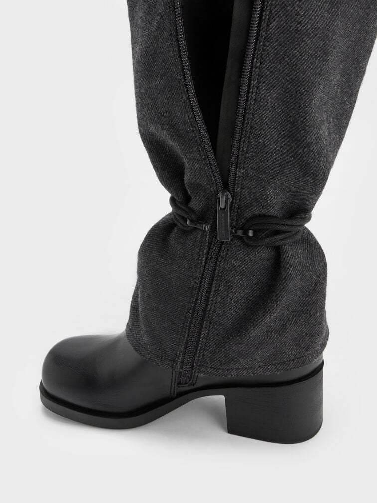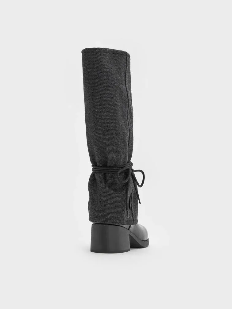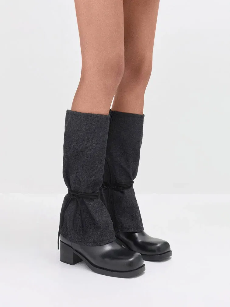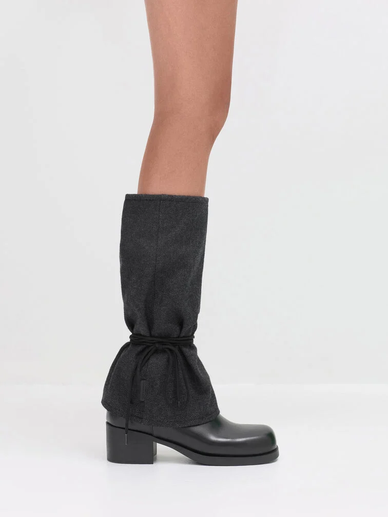 These knee-high boots in dark grey are made with felt and feature tie-around laces, chunky block heels, handy side zips and rounded square toes. Use them to introduce soft tactility and cosy warmth to minimalist winter outfits.