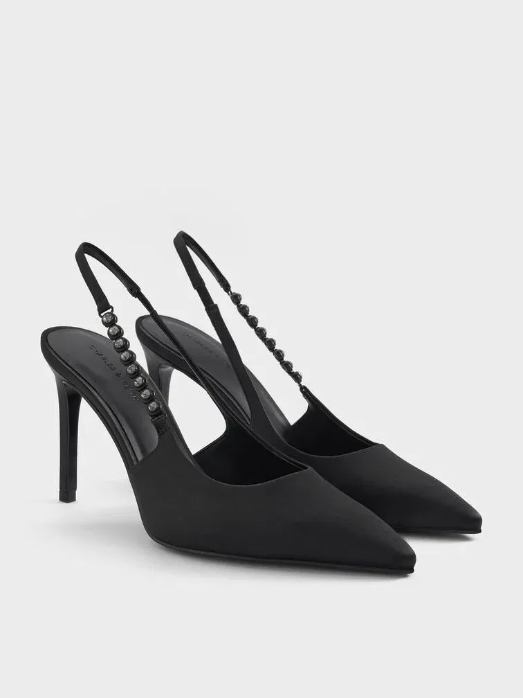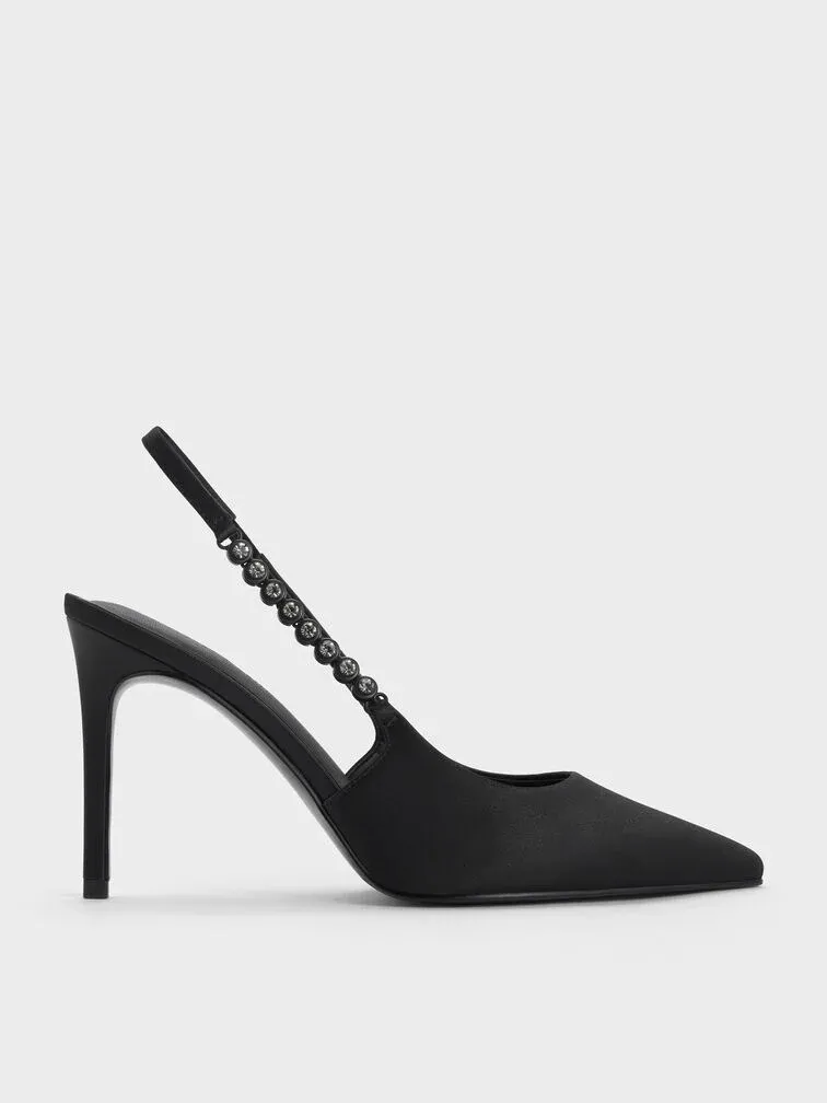 Add these all-black pointed-toe pumps to your style rotation right now. Whether you are headed for a party night out, a formal evening dinner or an afternoon tea, they will rise to any occasion. Take a closer look and you will notice that half of the slingback straps feature black crystal embellishments, which add to their glamour.