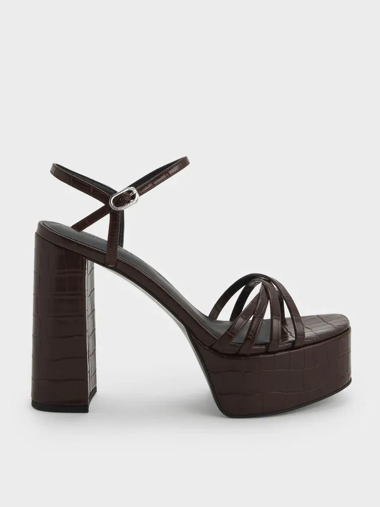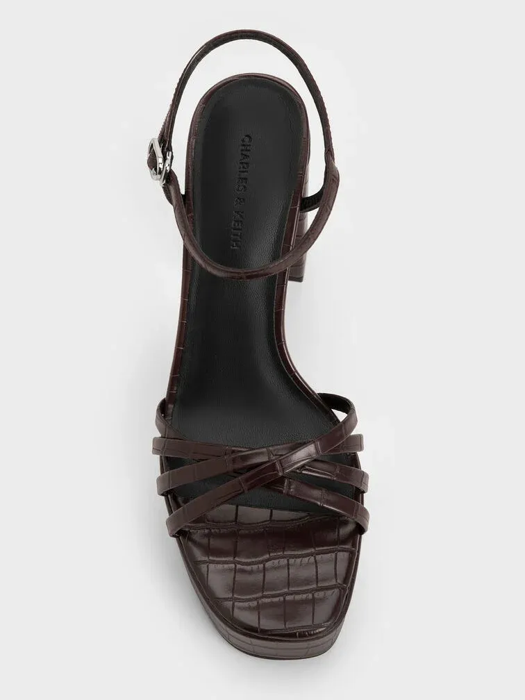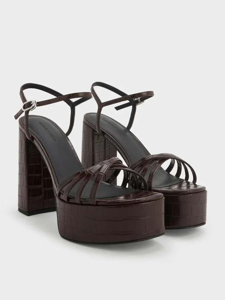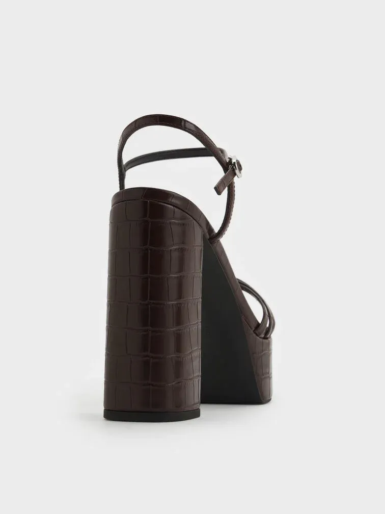 These Georgina platform sandals in espresso brown feature a croc-effect finish, ankle straps, open toes and thick soles. Match them with layered separates for directional grounding and visual strength.
