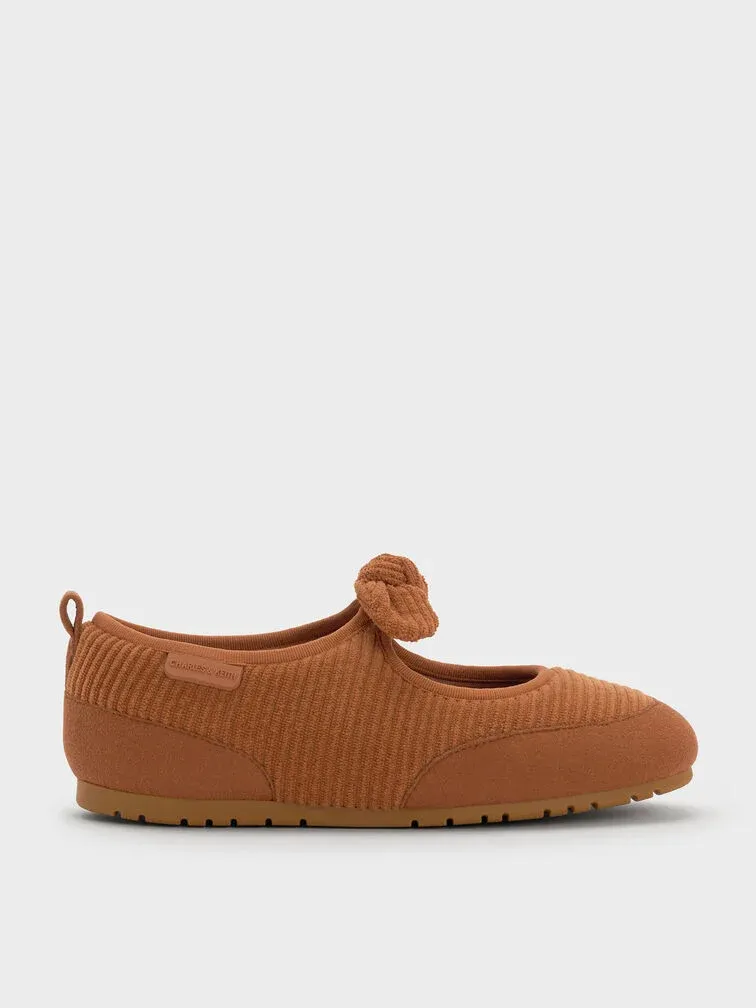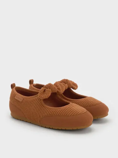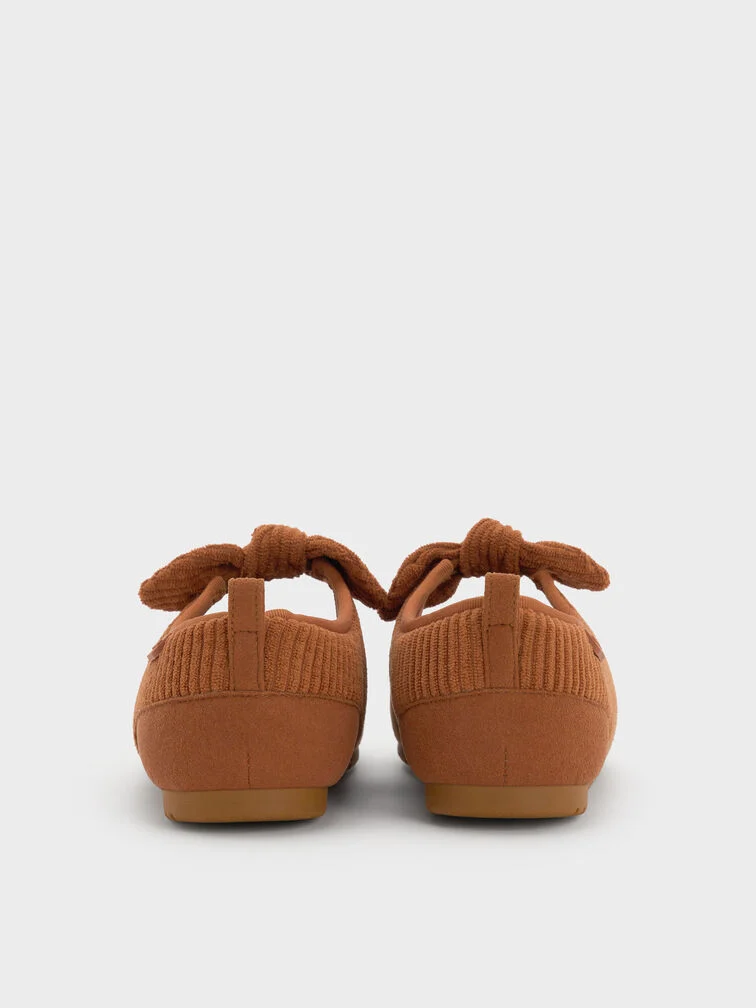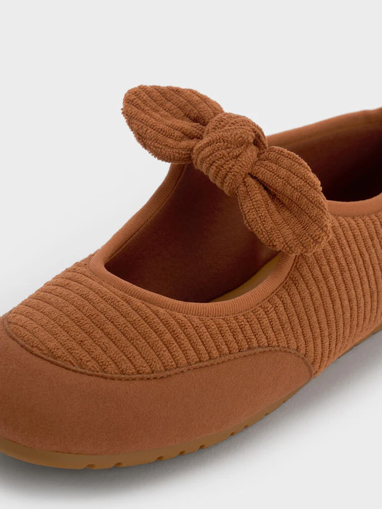 These Mary Jane flats for girls in brown are made with corduroy and faux suede. They feature charming knot-bow details, softly rounded toes and a sporty panelled design. Use them to add a playful accent and gentle charm to your little girl’s everyday looks.