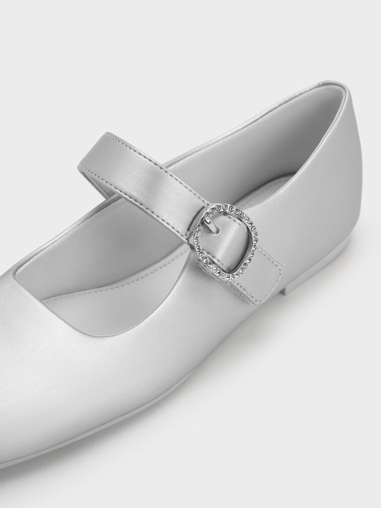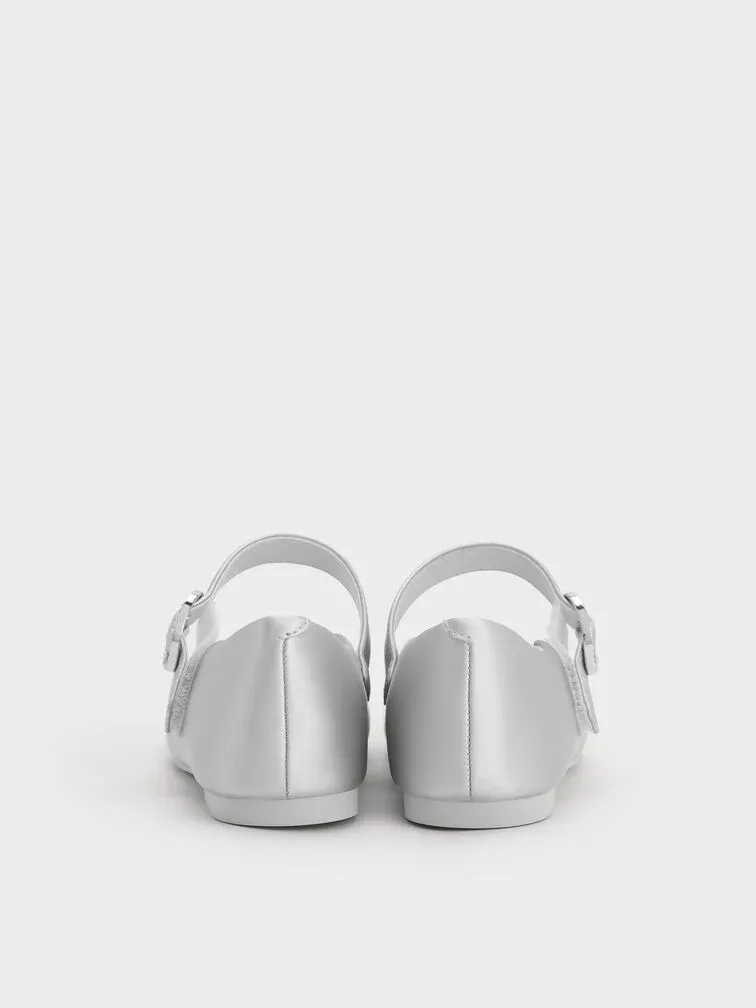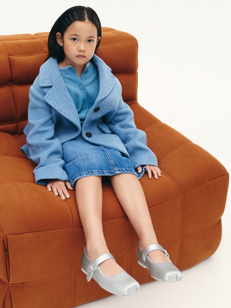 These Mary Jane flats for girls in silver feature a pearlescent finish, crystal-embellished buckles and blunt square toes. Let your little one wear them to add polish and subtle shine to their special-occasion or festive outfits.