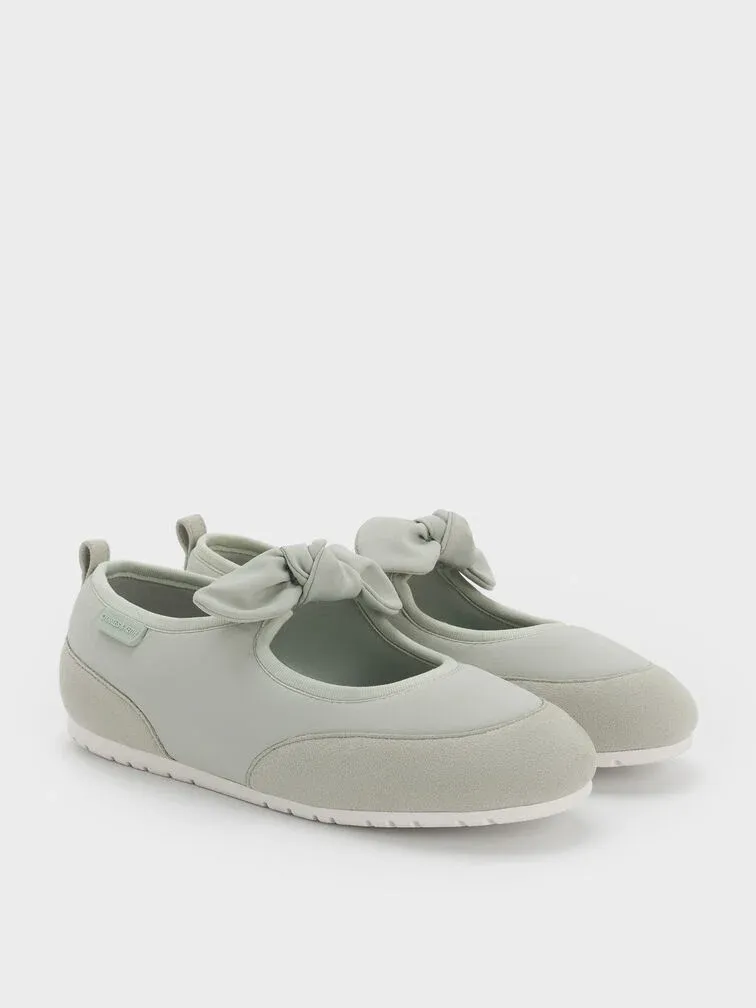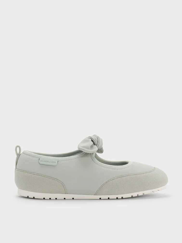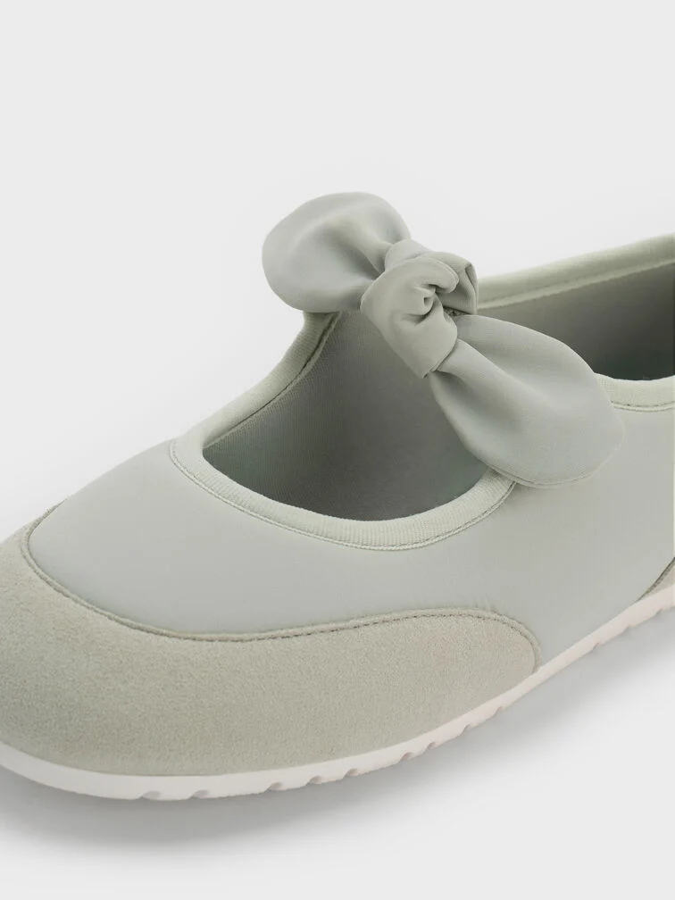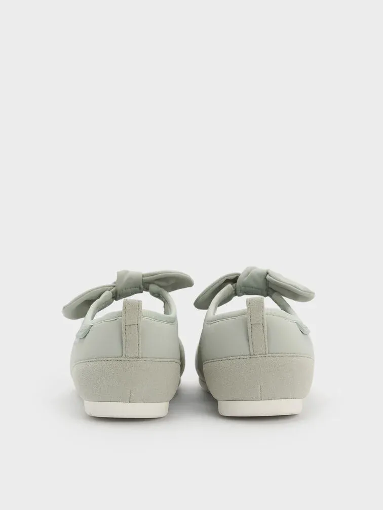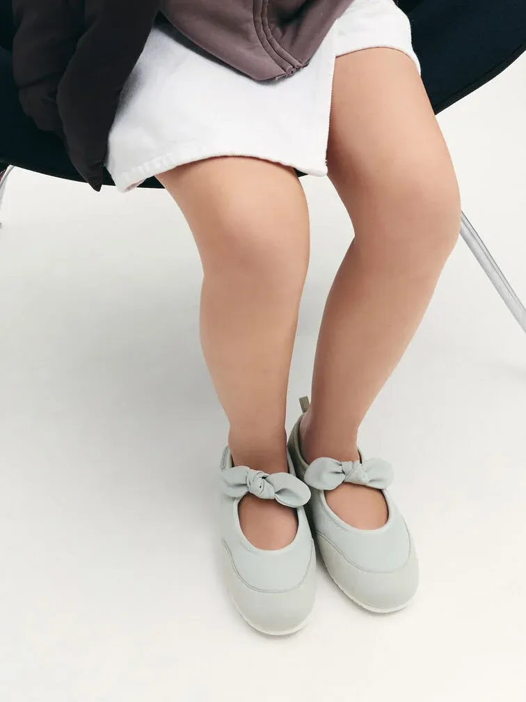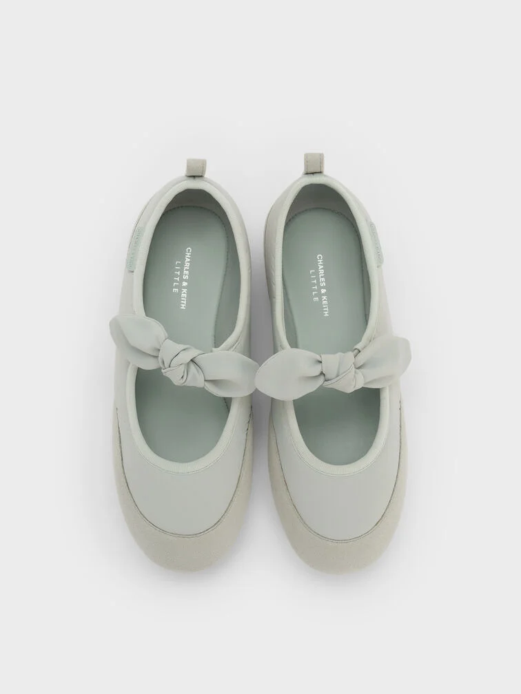 These Mary Jane flats for girls in mint green are made with nylon and faux suede. They feature knot-bow details, rounded toes and flat ridged soles. Let your little one wear them for comfort and charm.
