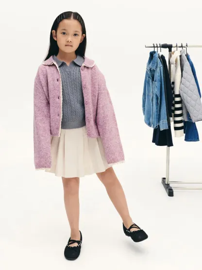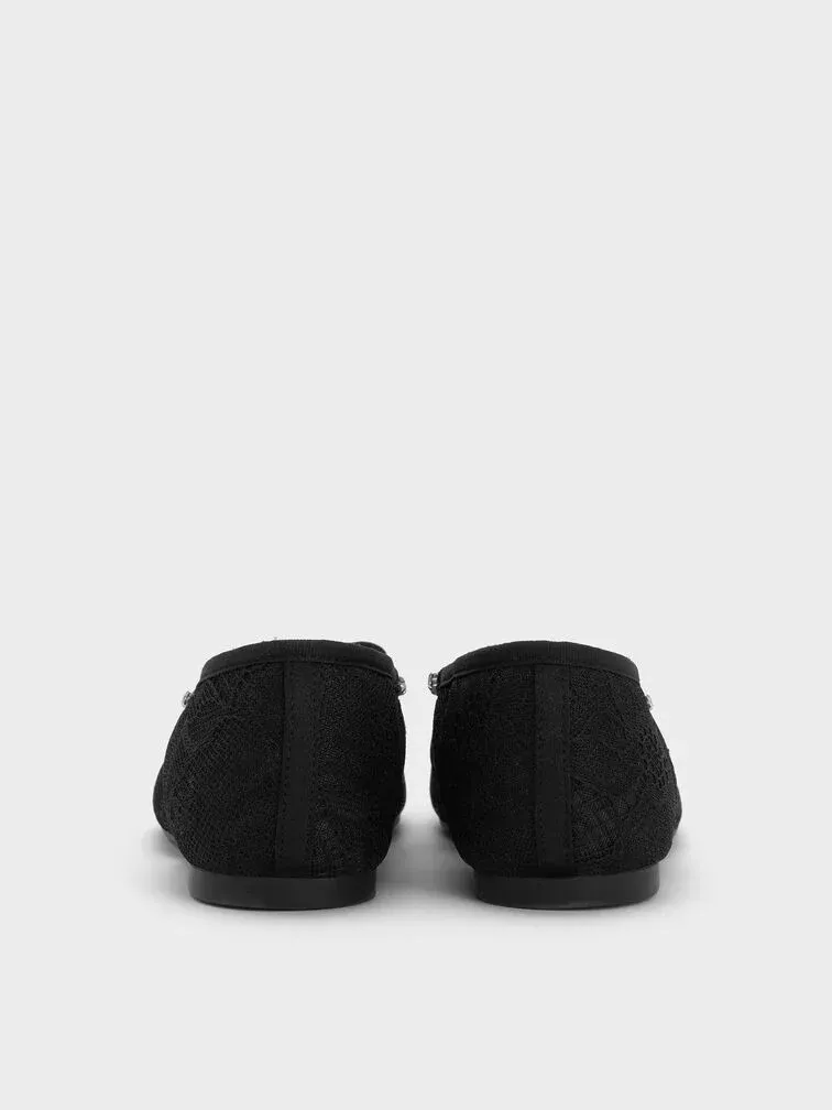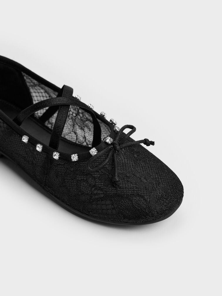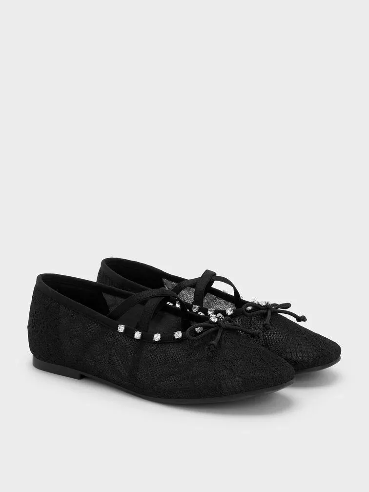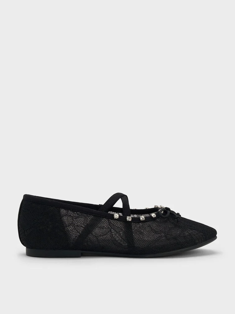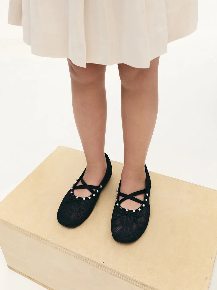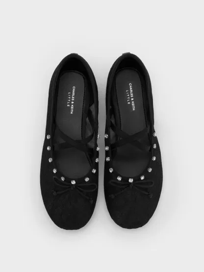 These ballet flats for girls in black are made with lace and feature delicate bow details, crystal embellishments, crossover straps, and softly rounded toes. Use them to bring polish and sweetness to your little one's special-occasion outfits.